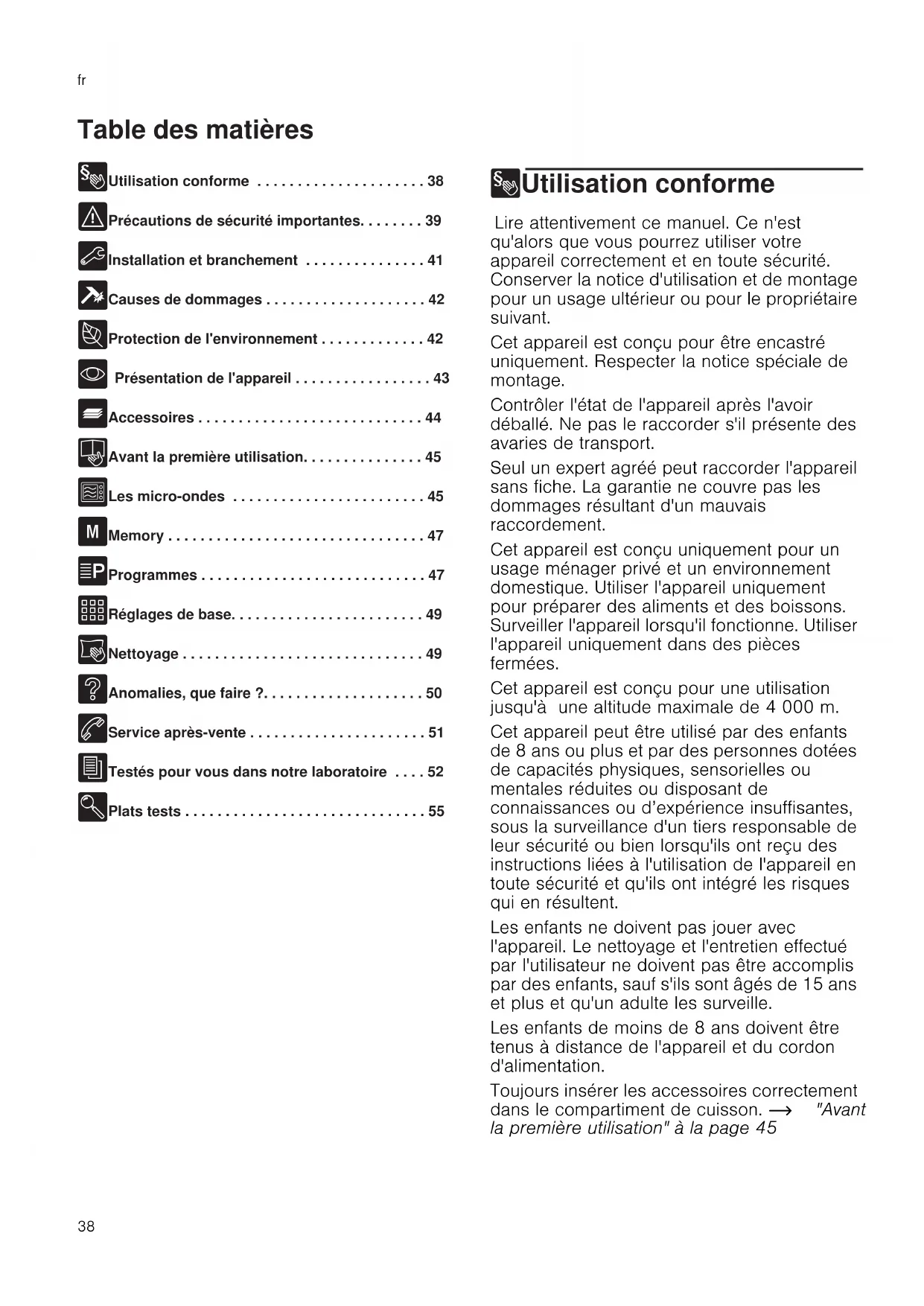 - Présentation de l'appareil . . . . . . . . . . . . . . . . . 43 _ Accessoires . . . . . . . . . . . . . . . . . . . . . . . . . . . . 44 K Avant la première utilisation. . . . . . . . . . . . . . . 45 ^ Les micro-ondes . . . . . . . . . . . . . . . . . . . . . . . . 45 B Memory . . . . . . . . . . . . . . . . . . . . . . . . . . . . . . . . 47 P Programmes . . . . . . . . . . . . . . . . . . . . . . . . . . . . 47 Q Réglages de base. . . . . . . . . . . . . . . . . . . . . . . . 49 D Nettoyage . . . . . . . . . . . . . . . . . . . . . . . . . . . . . . 49 3 Anomalies, que faire ?. . . . . . . . . . . . . . . . . . . . 50 4 Service après-vente . . . . . . . . . . . . . . . . . . . . . . 51 J Testés pour vous dans notre laboratoire . . . . 52 E Plats tests . . . . . . . . . . . . . . . . . . . . . . . . . . . . . . 55 8Utilisation conforme Utilisation conf or me Lire attentivement ce manuel. Ce n'est qu'alors que vous pourrez utiliser votre appareil correctement et en toute sécurité. Conserver la notice d'utilisation et de montage pour un usage ultérieur ou pour le propriétaire suivant. Cet appareil est conçu pour être encastré uniquement. Respecter la notice spéciale de montage. Contrôler l'état de l'appareil après l'avoir déballé. Ne pas le raccorder s'il présente des avaries de transport. Seul un expert agréé peut raccorder l'appareil sans fiche. La garantie ne couvre pas les dommages résultant d'un mauvais raccordement. Cet appareil est conçu uniquement pour un usage ménager privé et un environnement domestique. Utiliser l'appareil uniquement pour préparer des aliments et des boissons. Surveiller l'appareil lorsqu'il fonctionne. Utiliser l'appareil uniquement dans des pièces fermées. Cet appareil est conçu pour une utilisation jusqu'à une altitude maximale de 4 000 m. Cet appareil peut être utilisé par des enfants de 8 ans ou plus et par des personnes dotées de capacités physiques, sensorielles ou mentales réduites ou disposant de connaissances ou d’expérience insuffisantes, sous la surveillance d'un tiers responsable de leur sécurité ou bien lorsqu'ils ont reçu des instructions liées à l'utilisation de l'appareil en toute sécurité et qu'ils ont intégré les risques qui en résultent. Les enfants ne doivent pas jouer avec l'appareil. Le nettoyage et l'entretien effectué par l'utilisateur ne doivent pas être accomplis par des enfants, sauf s'ils sont âgés de 15 ans et plus et qu'un adulte les surveille. Les enfants de moins de 8 ans doivent être tenus à distance de l'appareil et du cordon d'alimentation. Toujours insérer les accessoires correctement dans le compartiment de cuisson. ~ "Avant la première utilisation" à la page 45Précautions de sécurité importantes fr