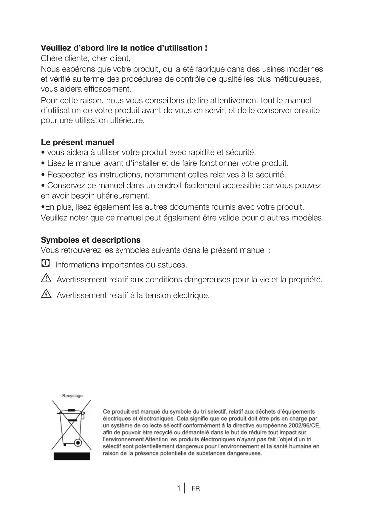- Lisez le manuel avant d’installer et de faire fonctionner votre produit.