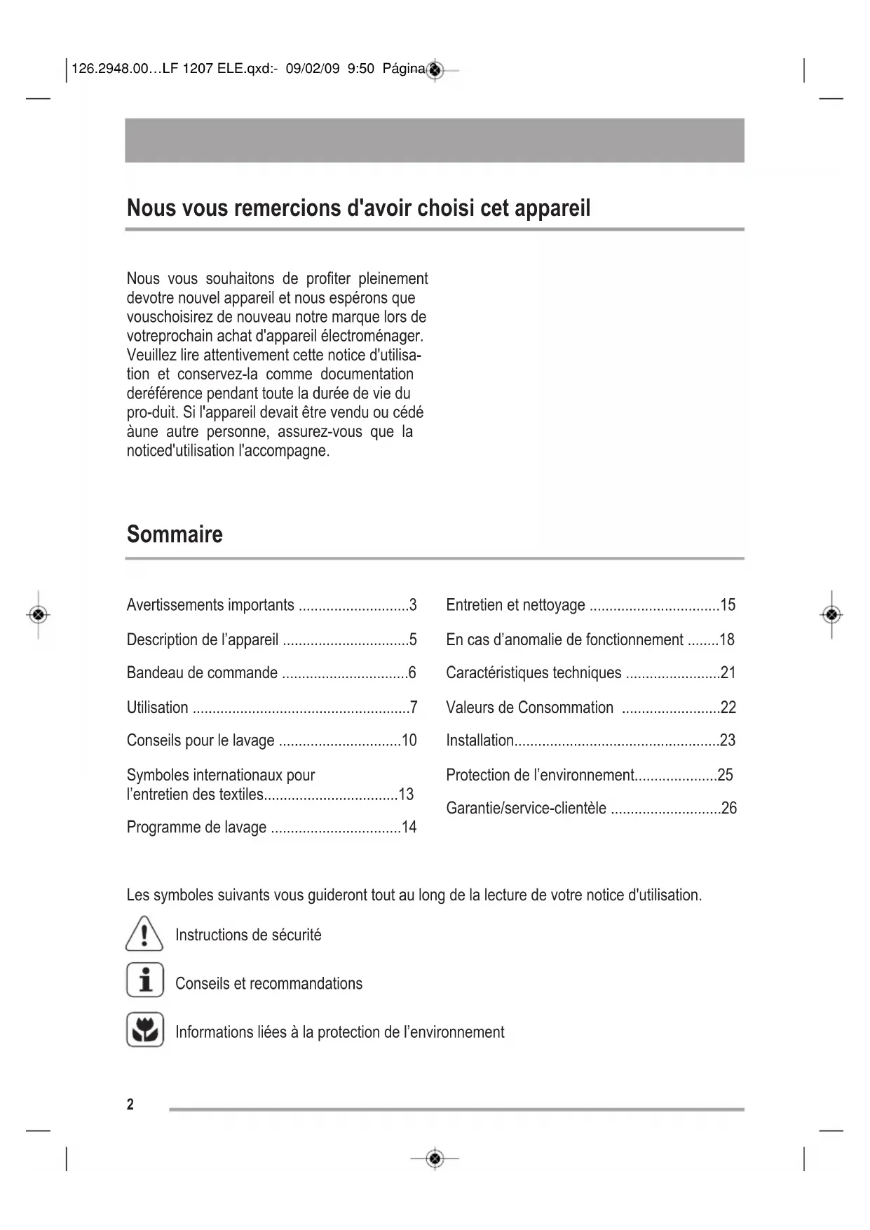 126.2948.00…LF 1207 ELE.qxd:- 09/02/09 9:50 Página 2425 Elimination du matériel Tous les matériaux marqués du symbole sont recyclables. >PE< = polyéthylène >PS< = polystyrène >PP< = polypropylène Déposez-les dans des conteneurs de collecte adaptés afin qu’ils puissent être recyclés. Elimination de l'ancien appareil Informez-vous auprès de la municipalité au sujet de l’endroit où déposer l’ancien appareil pour qu’il puisse être ensuite recyclé ou détruit. Le symbole sur le produit ou son emballage indique que ce produit ne peut être traité comme déchet ménager. Il doit être remis au point de collecte dédié à cet effet (collecte et recyclage du matériel électrique et électronique). En procédant à la mise au rebut de l'appareil dans les règles de l’art, nous préservons l'environnement et notre sécurité, s’assurant ainsi que les déchets seront traités dans des conditions optimum. Pour obtenir plus de détails sur le recyclage de ce produit, veuillez prendre contact avec les services de votre commune ou le magasin où vous avez effectué l'achat. Conseils écologiques Pour réaliser des économies d’eau et d’énergie, et ainsi contribuer à la protection de l’environnement, nous vous conseillons de respecter les instructions suivantes :