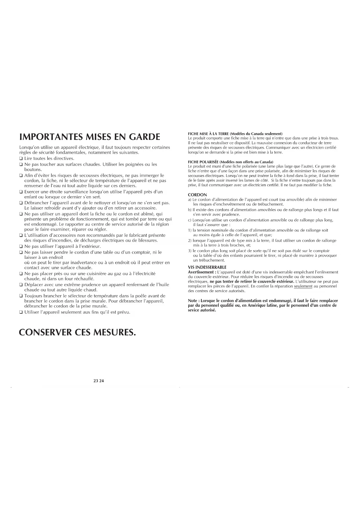 APROX. Huevos (fritos) 300° F De 3 a 5 minutos Huevos (revueltos) 325° F De 3 a 5 minutos Panqueques 375° F De 2 a 3 minutos cada lado Tostadas francesas 325° F De 2 a 4 minutos cada lado Sándwiches de queso derretido 325° F De 7 a 9 minutos Hamburguesas 375° F De 4 a 8 minutos para (de 5 a 6 oz) término casi crudo De 9 a 11 minutos para término medio Salchichas 350° F De 12 a 14 minutos Bistec en cubos 375° F De 12 a 14 minutos Chuletas de cerdo 350° F De 15 a 20 minutos Papas (fritas tipo campestre) 325° F De 12 a 15 minutos Filetes de pescado 350° F De 5 a 7 minutos (empanizados y fritos en poca grasa) SKG110UC 7/23/07 7:47 AM Page 2223 24 FICHE MISE À LA TERRE (Modèles du Canada seulement) Le produit comporte une fiche mise à la terre qui n’entre que dans une prise à trois trous. Il ne faut pas neutraliser ce dispositif. La mauvaise connexion du conducteur de terre présente des risques de secousses électriques. Communiquer avec un électricien certifié lorsqu’on se demande si la prise est bien mise à la terre. FICHE POLARISÉE (Modèles non offerts au Canada) Le produit est muni d’une fiche polarisée (une lame plus large que l’autre). Ce genre de fiche n’entre que d’une façon dans une prise polarisée, afin de minimiser les risques de secousses électriques. Lorsqu’on ne peut insérer la fiche à fond dans la prise, il faut tenter de le faire après avoir inversé les lames de côté. Si la fiche n’entre toujours pas dans la prise, il faut communiquer avec un électricien certifié. Il ne faut pas modifier la fiche. CORDON a) Le cordon d’alimentation de l’appareil est court (ou amovible) afin de minimiser les risques d’enchevêtrement ou de trébuchement. b) Il existe des cordons d’alimentation amovibles ou de rallonge plus longs et il faut s’en servir avec prudence. c) Lorsqu’on utilise un cordon d’alimentation amovible ou de rallonge plus long, il faut s’assurer que :