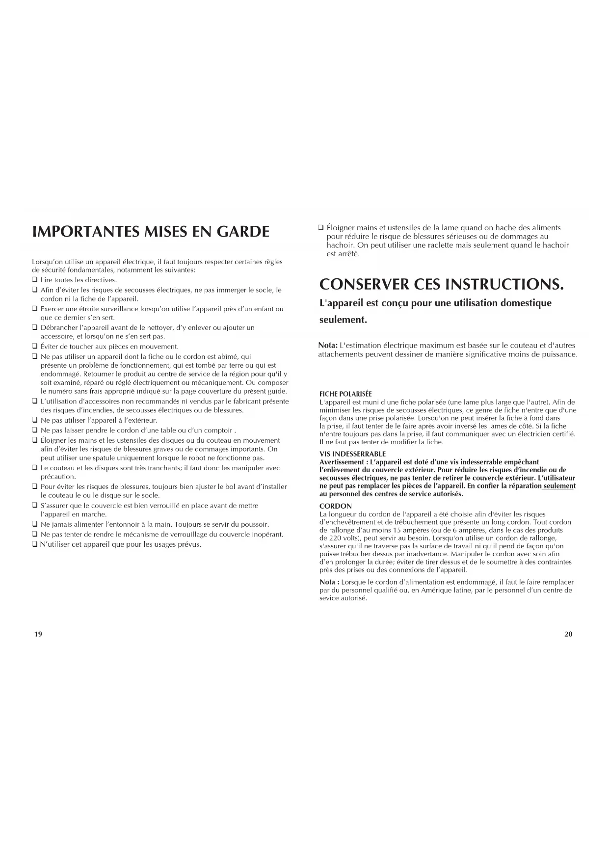 Ne pas tenter de rendre le mécanisme de verrouillage du couvercle inopérant. ❑ N’utiliser cet appareil que pour les usages prévus. CONSERVERCESINSTRUCTIONS. L'appareilestconçupouruneutilisationdomestique seulement.