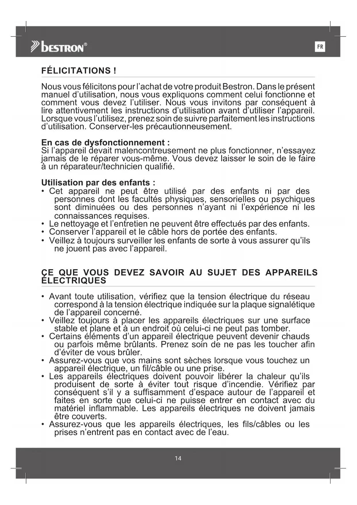 FÉLICITATIONS ! Nous vous félicitons pour l’achat de votre produit Bestron. Dans le présent manuel d’utilisation, nous vous expliquons comment celui fonctionne et comment vous devez l’utiliser. Nous vous invitons par conséquent à lire attentivement les instructions d’utilisation avant d’utiliser l’appareil. Lorsque vous l’utilisez, prenez soin de suivre parfaitement les instructions d’utilisation. Conserver-les précautionneusement. En cas de dysfonctionnement : Si l’appareil devait malencontreusement ne plus fonctionner, n’essayez jamais de le réparer vous-même. Vous devez laisser le soin de le faire à un réparateur/technicien qualifié. Utilisation par des enfants :