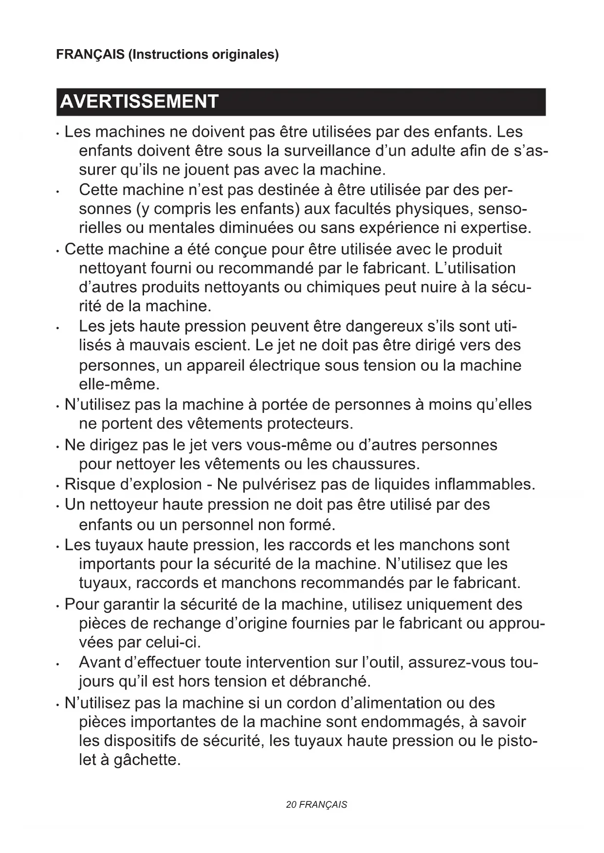 reux s’ils sont utilisés à mauvais escient. Le jet ne doit pas être dirigé vers les personnes, un appareil électrique sous tension ou la machine elle-même.