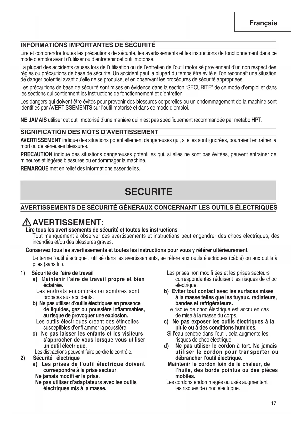 Lire et comprendre toutes les précautions de sécurité, les avertissements et les instructions de fonctionnement dans ce mode d’emploi avant d’utiliser ou d’entretenir cet outil motorisé. La plupart des accidents causés lors de l’utilisation ou de l’entretien de l’outil motorisé proviennent d’un non respect des règles ou précautions de base de sécurité. Un accident peut la plupart du temps être évité si l’on reconnaît une situation de danger potentiel avant qu’elle ne se produise, et en observant les procédures de sécurité appropriées. Les précautions de base de sécurité sont mises en évidence dans la section “SECURITE” de ce mode d’emploi et dans les sections qui contiennent les instructions de fonctionnement et d’entretien. Les dangers qui doivent être évités pour prévenir des blessures corporelles ou un endommagement de la machine sont identifi és par AVERTISSEMENTS sur l’outil motorisé et dans ce mode d’emploi. NE JAMAIS utiliser cet outil motorisé d’une manière qui n’est pas spécifi quement recommandée par metabo HPT.