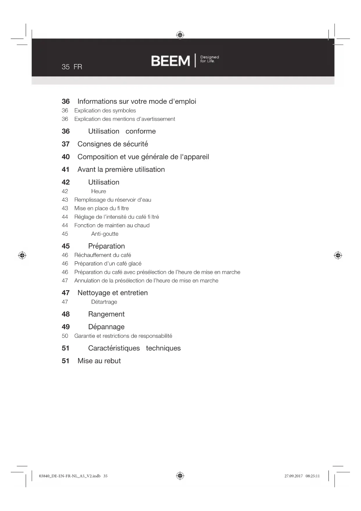36 Informations sur votre mode d'emploi 36 Explication des symboles 36 Explication des mentions d'avertissement 36 Utilisation conforme 37 Consignes de sécurité 40 Composition et vue générale de l'appareil 41 Avant la première utilisation 42 Utilisation 42 Heure 43 Remplissage du réservoir d'eau 43 Mise en place du filtre 44 Réglement de l'intensité du café filtré 44 Fonction de maintien au chaud 45 Anti-goutte 45 Préparation 46 Réchauffement du café 46 Préparation d'un café glacé 46 Préparation du café avec présélection de l'heure de mise en marche 47 Annulation de la présélection de l'heure de mise en marche 47 Nettoyage et entretien 47 Déterrage 48 Rangement 49 Dépannage 50 Garantie et restrictions de responsabilité 51 Caractéristiques techniques 51 Mise au rebut