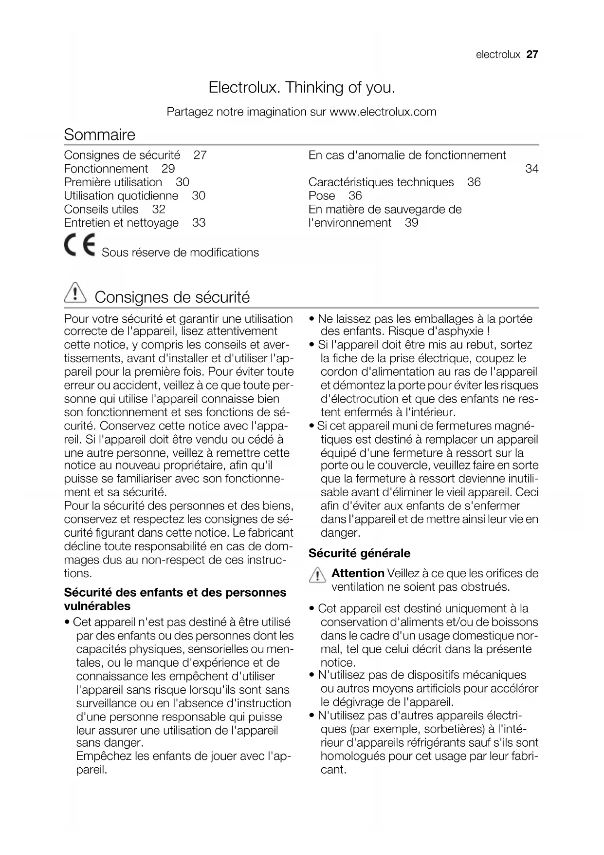 Caractéristiques techniques 36 Pose 36 En matière de sauvegarde de l'environnement 39 Sous réserve de modifications Consignes de sécurité Pour votre sécurité et garantir une utilisation correcte de l'appareil, lisez attentivement cette notice, y compris les conseils et aver- tissements, avant d'installer et d'utiliser l'ap- pareil pour la première fois. Pour éviter toute erreur ou accident, veillez à ce que toute per- sonne qui utilise l'appareil connaisse bien son fonctionnement et ses fonctions de sé- curité. Conservez cette notice avec l'appa- reil. Si l'appareil doit être vendu ou cédé à une autre personne, veillez à remettre cette notice au nouveau propriétaire, afin qu'il puisse se familiariser avec son fonctionne- ment et sa sécurité. Pour la sécurité des personnes et des biens, conservez et respectez les consignes de sé- curité figurant dans cette notice. Le fabricant décline toute responsabilité en cas de dom- mages dus au non-respect de ces instruc- tions. Sécurité des enfants et des personnes vulnérables