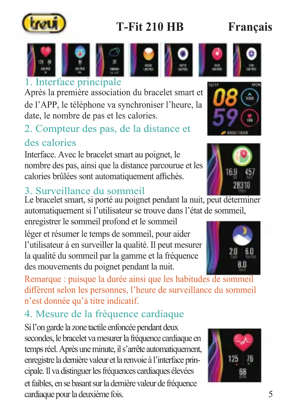Veuillez consulter votre médecin avant de pratiquer un nouveau sport. Le bracelet smart ne doit pas être utilisé à des ns médicales, même s’il peut surveiller la fréquence cardiaque en temps réel et de manière dynamique. FrançaisT-Fit 210 HB