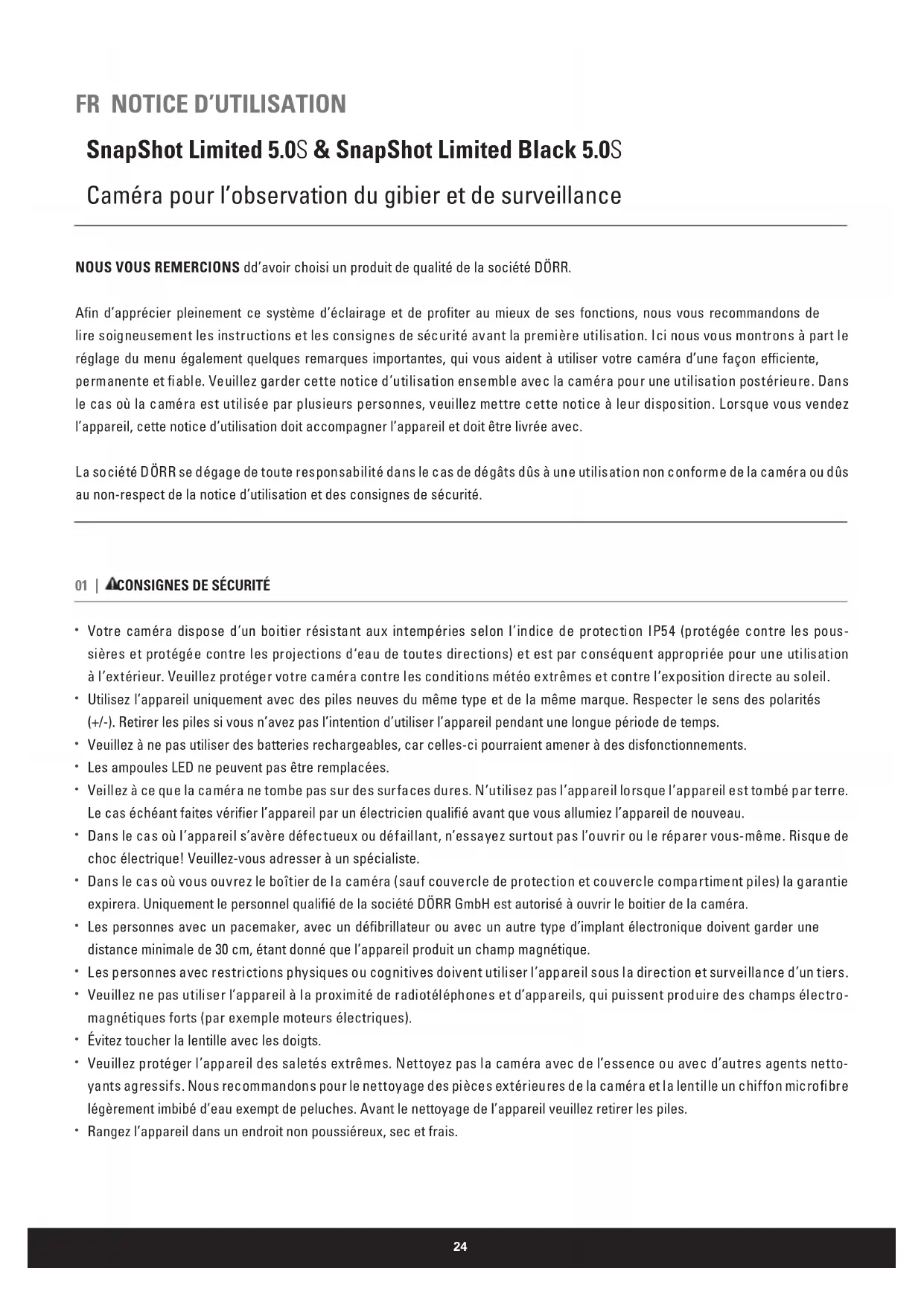 L’appareil fonctionne uniquement avec une carte mémoire SD. Ils existent des cartes SD qui ne sont pas compatibles avec l’appareil DÖRR SnapShot et peuvent aecter la fonction de l’appareil. Il sut normale- ment d‘échanger la carte mémoire (une autre marque, une autre capacité). La capacité de la carte ne doit pas dépasser les 32 GB. La lentille claque Un filtre est monté sur la lentille, qui permet réaliser, d’un côté des enregistrements diurnes en couleur, et d’autre côté des enregistrements nocturnes noir et blanc avec le flash infrarouge. Ce filtre, lorsque l’appareil est commuté hors service n’est pas fixe et bouge de côté et d’autre, ce qui peut produire un léger claquement. Il ne s’agit pas d’une défaillance et le bruit est tout à fait normal. Résistance aux intempéries Bien que la caméra soit résistante aux intempéries et appropriée pour une utilisation à l’extérieur, il est convenable installer les caméras dans des sites protégés, c.a.d. ne pas les installer sur la face exposée aux intempéries ou en plein soleil. Après une longue période d’humidité, par exemple de brouillard ou de pluie, la caméra devait être stockée dans un espace sec. Protégée contre les poussières et les projections d’eau selon l’indice de protection IP54. Détecteur de mouvement Le détecteur ne réagit que sous certaines conditions et dans une zone précise. La saisie des objets dépend aussi fortement de la température actuelle et d’autre circonstances, tel que végétation, surfaces réfléchis- santes etc. Lors des conditions optimales, d’une orientation parfaite et d’un réglage avec la plus grande sensibilité, le déclenchement peut avoir lieu jusqu’à 12-15 mètres. Normalement on doit partir du principe d’une zone à l’intérieur des 10 mètres. Quelquefois il faut faire quelques essais, afin d’obtenir un bon posi- tionnement de la caméra. Lors des essais de déclenchement par des personnes, il faut prendre en consi- dération que les animaux sont bien plus petits et pour cela échappent souvent à la zone de déclenchement. Conditions de lumière Comme dans le cas de prise de vues normale, le contre-jour direct n’est pas positif. Pour cela choisir la po- sition de la caméra de telle sorte que soit la lumière n’arrive pas par le devant soit la caméra est à l’ombre. Modifications techniques Les spécifications et la conception sont sujettes à des changements sans préavis. Nouveaux manuels s‘il vous plaît télécharger ici: http://download.doerrfoto.info/manuals/Snapshot_20manuals/