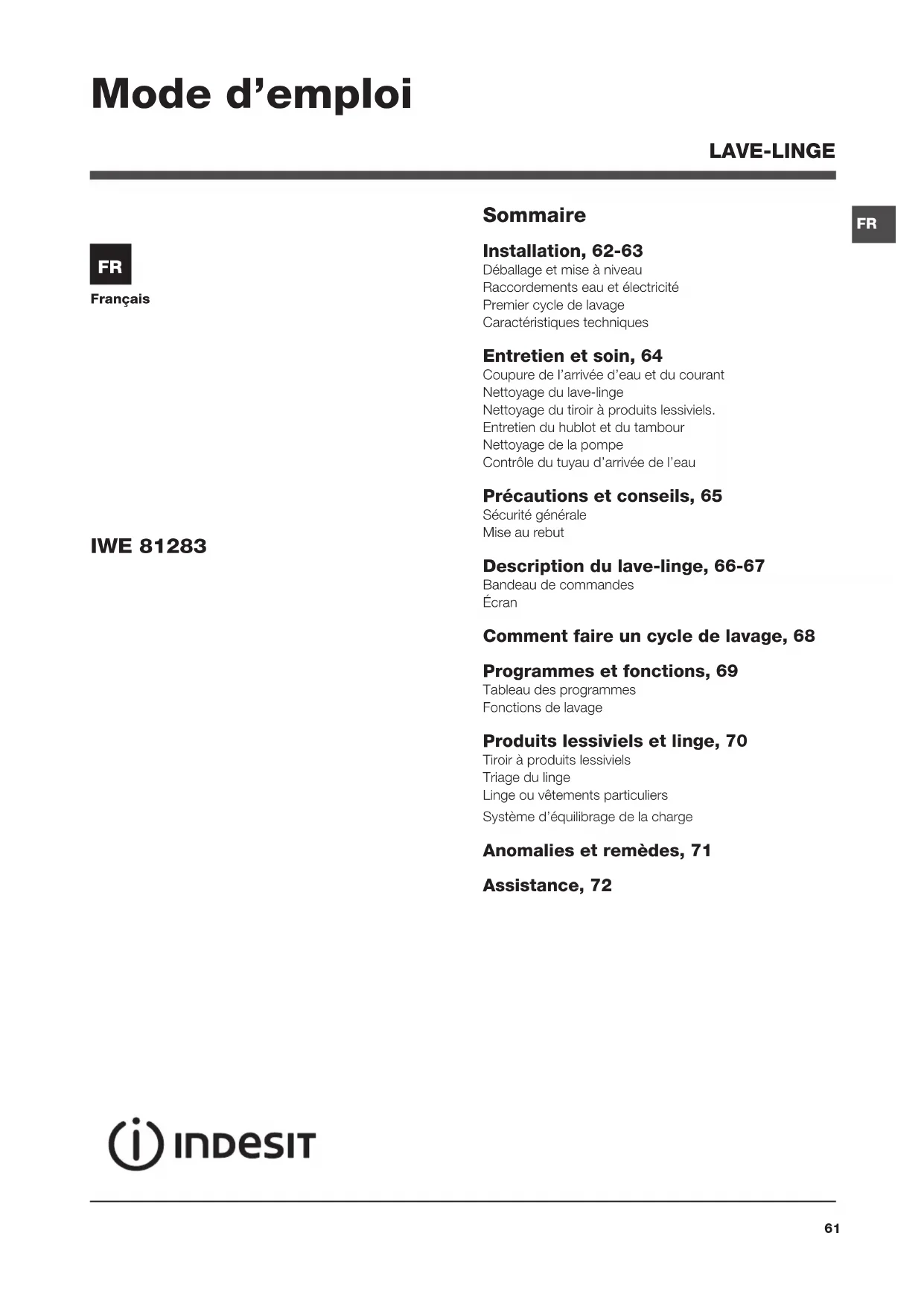 Français Sommaire Installation, 62-63 Déballage et mise à niveau Raccordements eau et électricité Premier cycle de lavage Caractéristiques techniques Entretien et soin, 64 Coupure de l’arrivée d’eau et du courant Nettoyage du lave-linge Nettoyage du tiroir à produits lessiviels. Entretien du hublot et du tambour Nettoyage de la pompe Contrôle du tuyau d’arrivée de l’eau Précautions et conseils, 65 Sécurité générale Mise au rebut Description du lave-linge, 66-67 Bandeau de commandes Écran Comment faire un cycle de lavage, 68 Programmes et fonctions, 69 Tableau des programmes Fonctions de lavage Produits lessiviels et linge, 70 Tiroir à produits lessiviels Triage du linge Linge ou vêtements particuliers Système d’équilibrage de la charge Anomalies et remèdes, 71 Assistance, 72