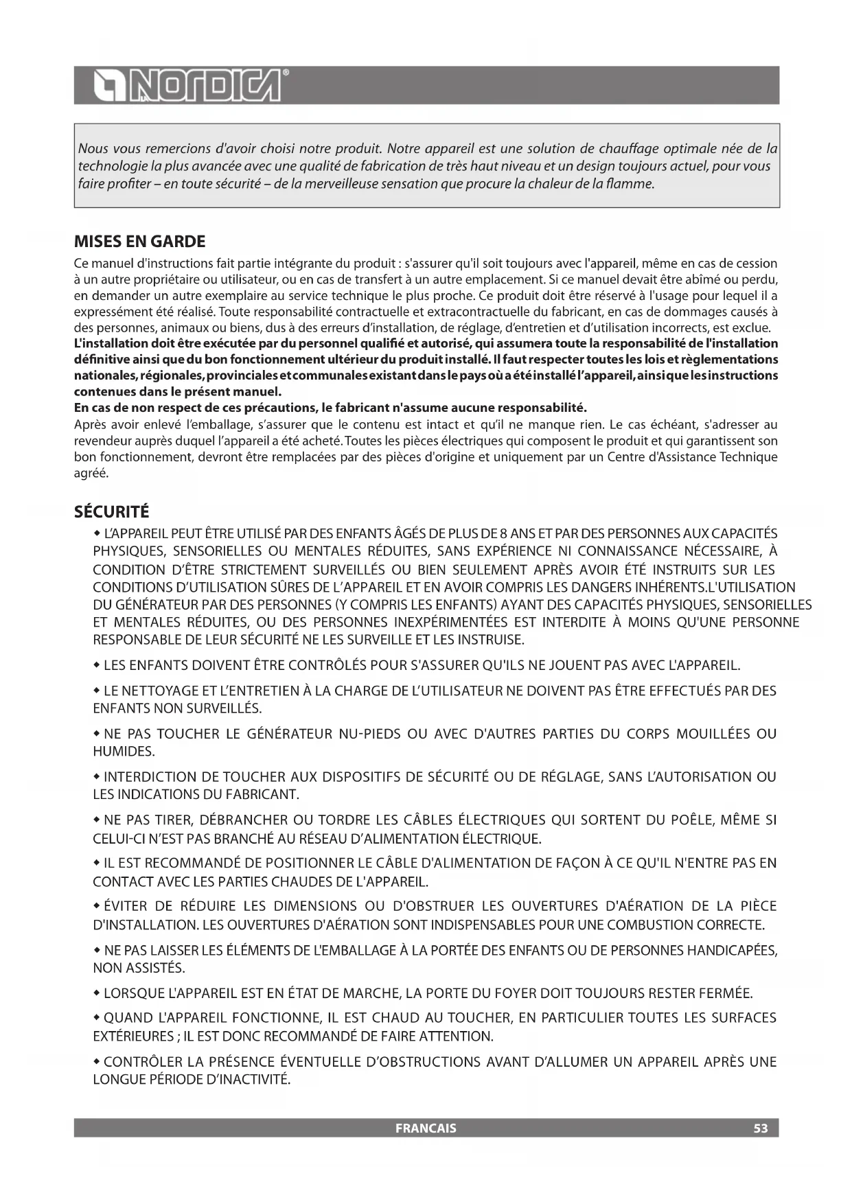 Ce manuel d'instructions fait partie intégrante du produit: s'assurer qu'il soit toujours avec l'appareil, même en cas de cession à un autre propriétaire ou utilisateur, ou en cas de transfert à un autre emplacement. Si ce manuel devait être abîmé ou perdu, en demander un autre exemplaire au service technique le plus proche. Ce produit doit être réservé à l'usage pour lequel il a expressément été réalisé. Toute responsabilité contractuelle et extracontractuelle du fabricant, en cas de dommages causés à des personnes, animaux ou biens, dus à des erreurs d’installation, de réglage, d’entretien et d’utilisation incorrects, est exclue. L'installation doit être exécutée par du personnel qualié et autorisé, qui assumera toute la responsabilité de l'installation dénitive ainsi que du bon fonctionnement ultérieur du produit installé. Il faut respecter toutes les lois et règlementations nationales, régionales, provinciales et communales existant dans le pays où a été installé l’appareil, ainsi que les instructions contenues dans le présent manuel. En cas de non respect de ces précautions, le fabricant n'assume aucune responsabilité. Après avoir enlevé l’emballage, s’assurer que le contenu est intact et qu’il ne manque rien. Le cas échéant, s'adresser au revendeur auprès duquel l’appareil a été acheté. Toutes les pièces électriques qui composent le produit et qui garantissent son bon fonctionnement, devront être remplacées par des pièces d'origine et uniquement par un Centre d'Assistance Technique agréé. SÉCURITÉ L’APPAREIL PEUT ÊTRE UTILISÉ PAR DES ENFANTS ÂGÉS DE PLUS DE 8 ANS ET PAR DES PERSONNES AUX CAPACITÉS PHYSIQUES, SENSORIELLES OU MENTALES RÉDUITES, SANS EXPÉRIENCE NI CONNAISSANCE NÉCESSAIRE, À CONDITION D’ÊTRE STRICTEMENT SURVEILLÉS OU BIEN SEULEMENT APRÈS AVOIR ÉTÉ INSTRUITS SUR LES CONDITIONS D’UTILISATION SÛRES DE L’APPAREIL ET EN AVOIR COMPRIS LES DANGERS INHÉRENTS.L'UTILISATION DU GÉNÉRATEUR PAR DES PERSONNES (Y COMPRIS LES ENFANTS) AYANT DES CAPACITÉS PHYSIQUES, SENSORIELLES ET MENTALES RÉDUITES, OU DES PERSONNES INEXPÉRIMENTÉES EST INTERDITE À MOINS QU'UNE PERSONNE RESPONSABLE DE LEUR SÉCURITÉ NE LES SURVEILLE ET LES INSTRUISE. LES ENFANTS DOIVENT ÊTRE CONTRÔLÉS POUR S'ASSURER QU'ILS NE JOUENT PAS AVEC L'APPAREIL. LE NETTOYAGE ET L’ENTRETIEN À LA CHARGE DE L’UTILISATEUR NE DOIVENT PAS ÊTRE EFFECTUÉS PAR DES ENFANTS NON SURVEILLÉS. NE PAS TOUCHER LE GÉNÉRATEUR NU-PIEDS OU AVEC D'AUTRES PARTIES DU CORPS MOUILLÉES OU HUMIDES. INTERDICTION DE TOUCHER AUX DISPOSITIFS DE SÉCURITÉ OU DE RÉGLAGE, SANS L’AUTORISATION OU LES INDICATIONS DU FABRICANT. NE PAS TIRER, DÉBRANCHER OU TORDRE LES CÂBLES ÉLECTRIQUES QUI SORTENT DU POÊLE, MÊME SI CELUI-CI N’EST PAS BRANCHÉ AU RÉSEAU D’ALIMENTATION ÉLECTRIQUE. IL EST RECOMMANDÉ DE POSITIONNER LE CÂBLE D'ALIMENTATION DE FAÇON À CE QU'IL N'ENTRE PAS EN CONTACT AVEC LES PARTIES CHAUDES DE L'APPAREIL. ÉVITER DE RÉDUIRE LES DIMENSIONS OU D'OBSTRUER LES OUVERTURES D'AÉRATION DE LA PIÈCE D'INSTALLATION. LES OUVERTURES D'AÉRATION SONT INDISPENSABLES POUR UNE COMBUSTION CORRECTE. NE PAS LAISSER LES ÉLÉMENTS DE L'EMBALLAGE À LA PORTÉE DES ENFANTS OU DE PERSONNES HANDICAPÉES, NON ASSISTÉS. LORSQUE L'APPAREIL EST EN ÉTAT DE MARCHE, LA PORTE DU FOYER DOIT TOUJOURS RESTER FERMÉE. QUAND L'APPAREIL FONCTIONNE, IL EST CHAUD AU TOUCHER, EN PARTICULIER TOUTES LES SURFACES EXTÉRIEURES; IL EST DONC RECOMMANDÉ DE FAIRE ATTENTION. CONTRÔLER LA PRÉSENCE ÉVENTUELLE D’OBSTRUCTIONS AVANT D’ALLUMER UN APPAREIL APRÈS UNE LONGUE PÉRIODE D’INACTIVITÉ. 53FRANCAIS LE GÉNÉRATEUR A ÉTÉ CONÇU POUR ÊTRE UTILISÉ DANS N’IMPORTE QUELLE CONDITION CLIMATIQUE. CEPENDANT, EN CAS DE CLIMAT PARTICULIÈREMENT DÉFAVORABLE VENT FORT, GEL, LES SYSTÈMES DE SÉCURITÉ POURRAIENT SE DÉCLENCHER, PROVOQUANT AINSI L’ARRÊT DU GÉNÉRATEUR. SI CELA SE VÉRIFIE, CONTACTER LE SERVICE D’ASSISTANCE TECHNIQUE ET SURTOUT NE PAS DÉSACTIVER LES SYSTÈMES DE SÉCURITÉ. EN CAS D'INCENDIE DU CONDUIT DE FUMÉE, SE MUNIR D'EXTINCTEURS POUR ÉTOUFFER LES FLAMMES OU APPELER LES POMPIERS. CET APPAREIL NE DOIT PAS ÊTRE UTILISÉ COMME INCINÉRATEUR DE DÉCHETS.