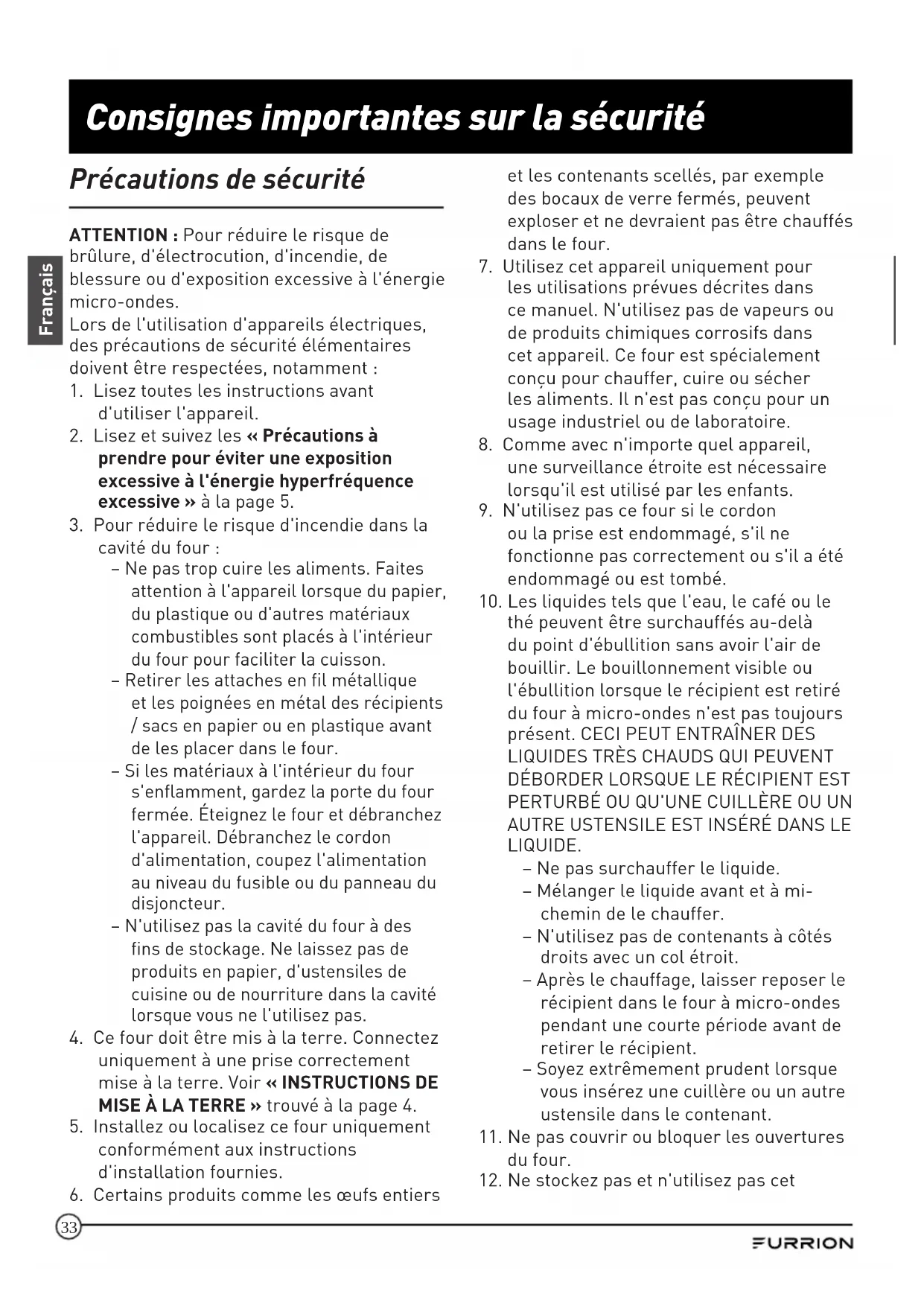 - 1,5 pi cu Four à micro-ondes à convection OTR. Avant utiliser votre nouvel appareil, veuillez lire ces consignes attentivement. Le présent guide d’utilisation contient des informations permettant l’utilisation, l’installation et l’entretien en toute sécurité de l’appareil. Veuillez conserver le présent guide d’utilisation en lieu sûr pour vous y référer ultérieurement, afin d’assurer votre sécurité et de réduire les risques de blessure. Veuillez aussi remettre le présent manuel à tout nouveau propriétaire de cet appareil. Le fabricant décline toute responsabilité en cas de dommages dus au non-respect des présentes consignes. Si vous avez des questions sur nos produits, veuillez nous contacter : support@furrion.com32 Français Contenu Bienvenue p. 31