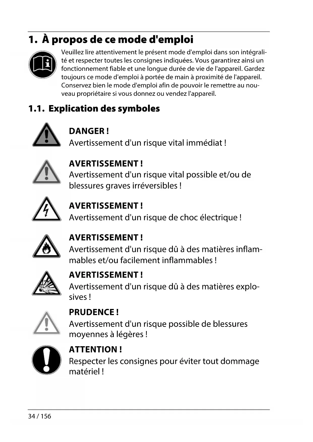 33 / 1561. À propos de ce mode d'emploi Veuillez lire attentivement le présent mode d'emploi dans son intégrali- té et respecter toutes les consignes indiquées. Vous garantirez ainsi un fonctionnement fiable et une longue durée de vie de l'appareil. Gardez toujours ce mode d'emploi à portée de main à proximité de l'appareil. Conservez bien le mode d'emploi afin de pouvoir le remettre au nou- veau propriétaire si vous donnez ou vendez l'appareil. 1.1. Explication des symboles DANGER ! Avertissement d'un risque vital immédiat ! AVERTISSEMENT ! Avertissement d'un risque vital possible et/ou de blessures graves irréversibles ! AVERTISSEMENT ! Avertissement d'un risque de choc électrique ! AVERTISSEMENT ! Avertissement d'un risque dû à des matières inflam- mables et/ou facilement inflammables ! AVERTISSEMENT ! Avertissement d'un risque dû à des matières explo- sives ! PRUDENCE ! Avertissement d'un risque possible de blessures moyennes à légères! ATTENTION! Respecter les consignes pour éviter tout dommage matériel ! 34 / 156REMARQUE ! Informations supplémentaires pour l'utilisation de l'appareil ! REMARQUE ! Respecter les consignes du mode d'emploi !