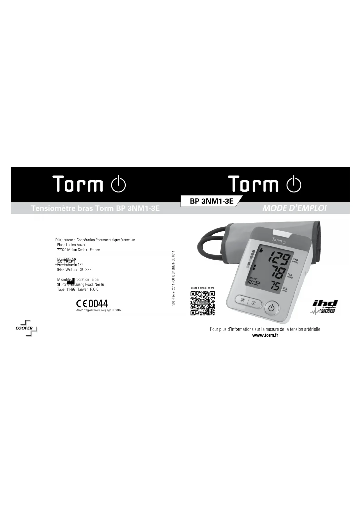 Pour plus d’informations sur la mesure de la tension artérielle www.torm.fr Tensiomètre bras Torm BP 3NM1-3E Distributeur : Coopération Pharmaceutique Française Place Lucien Auvert 77020 Melun Cedex - France Microlife AG Espenstrasse 139 9443 Widnau - SUISSE Microlife Corporation Taipei 9F, 431, RuiGuang Road, NeiHu Tapei 11492, Taïwan, R.O.C. V02 - Février 2014 - CO IB BP 3NM1- 3E 0814 Année d’apposition du marquage CE : 2012Mode d’emploi animéSommaire