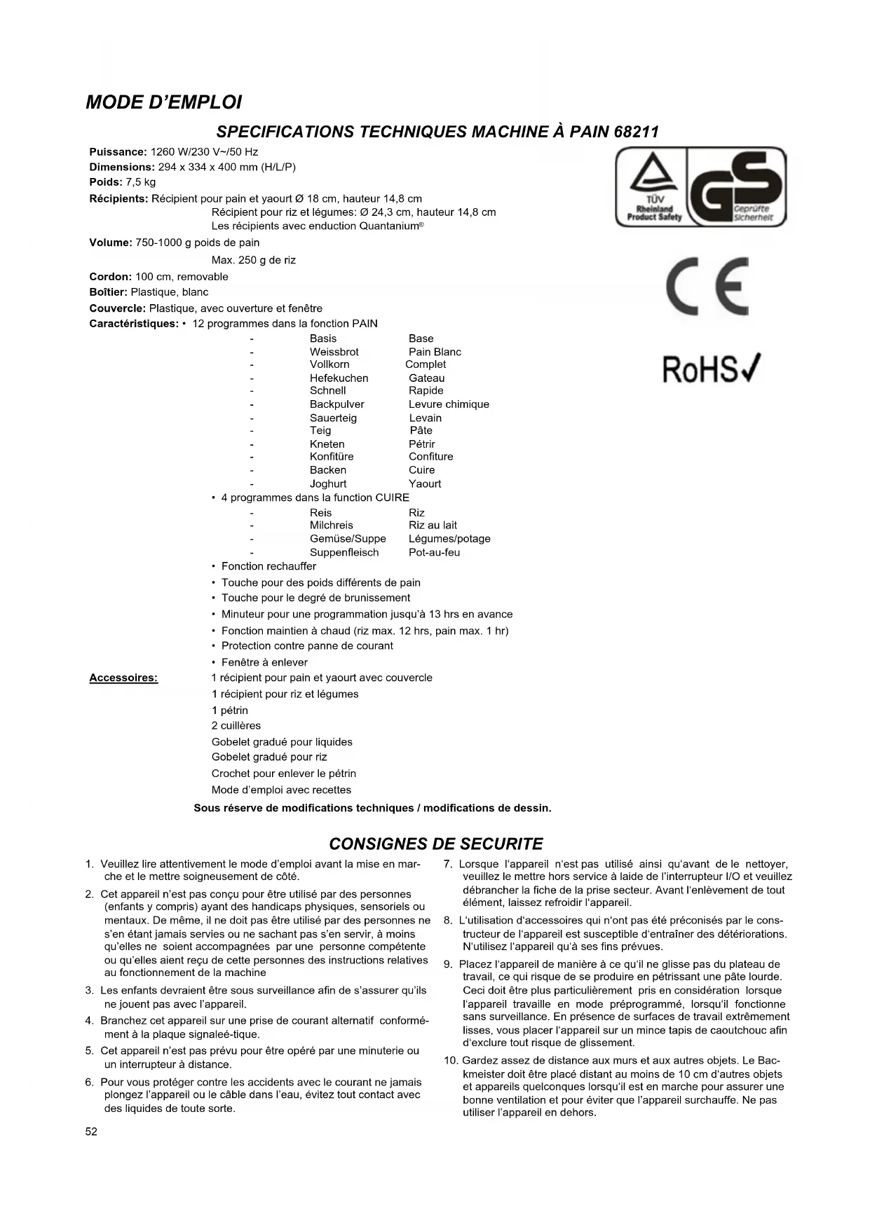 - Fenêtre à enlever Accessoires: 1 récipient pour pain et yaourt avec couvercle 1 récipient pour riz et légumes 1 pétrin 2 cuillères Gobelet gradué pour liquides Gobelet gradué pour riz Crochet pour enlever le pétrin Mode d’emploi avec recettes Sous réserve de modications techniques / modications de dessin.53 avaNT d’UTILIsEr L’aPParEIL