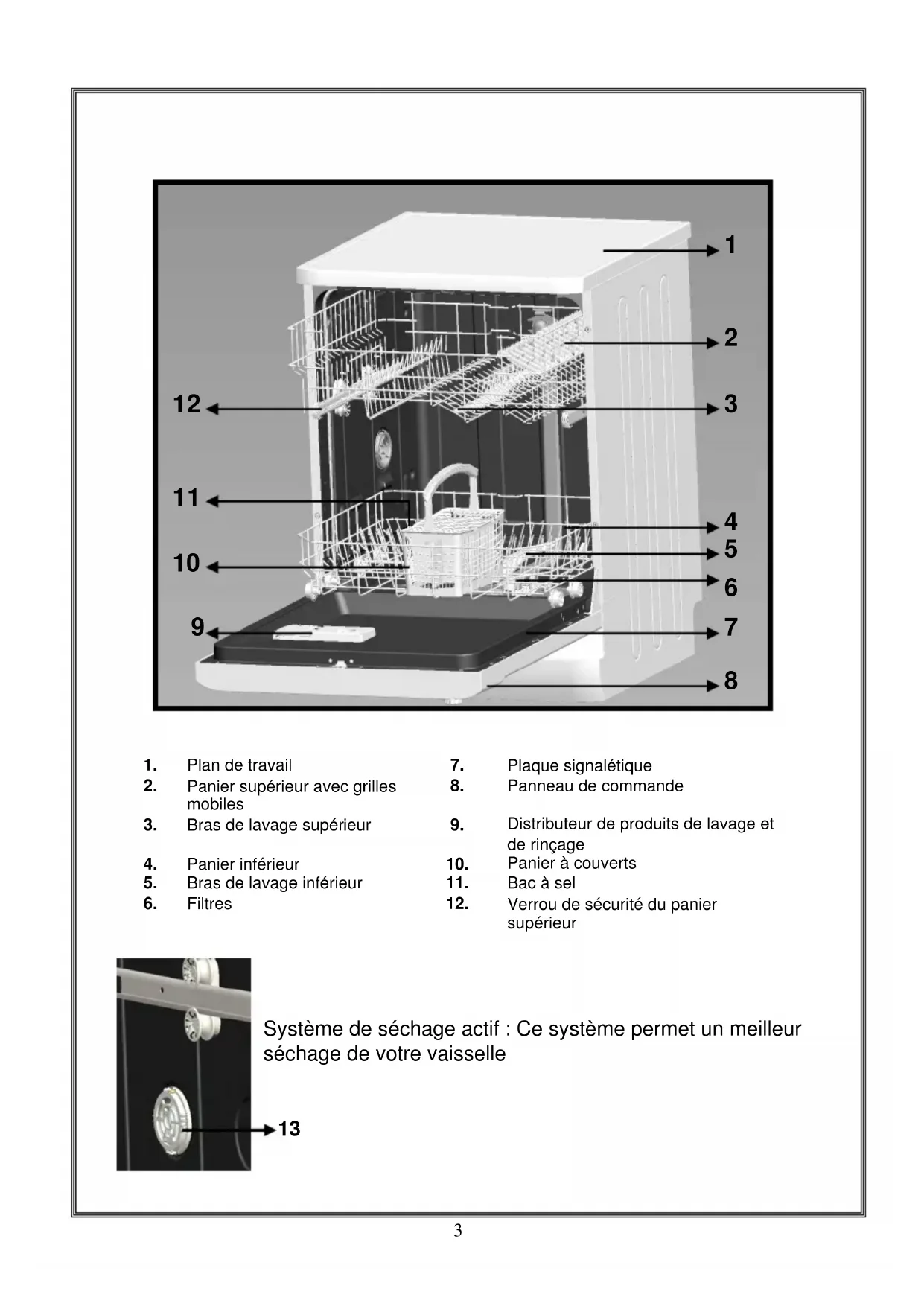 Système de séchage actif : Ce système permet un meilleur séchage de votre vaisselle 131.) Touche Marche/Arrêt Quand on appuie sur la touche Marche/Arrêt, le témoin lumineux situé sur la touche Départ/ Pause s’allume. 2.) Poignée de la porte La poignée de la porte sert à ouvrir/fermer la porte de la machine. 3.) Touche Départ différé Grace à cette option, vous pouvez différer le départ de votre lave vaisselle de 3-6-9-12 heures. Quand on appuie sur la touche“Départ différé”, le témoin lumineux 3h s’allume. Pour obtenir l’indication 6h, 9h ou 12h,