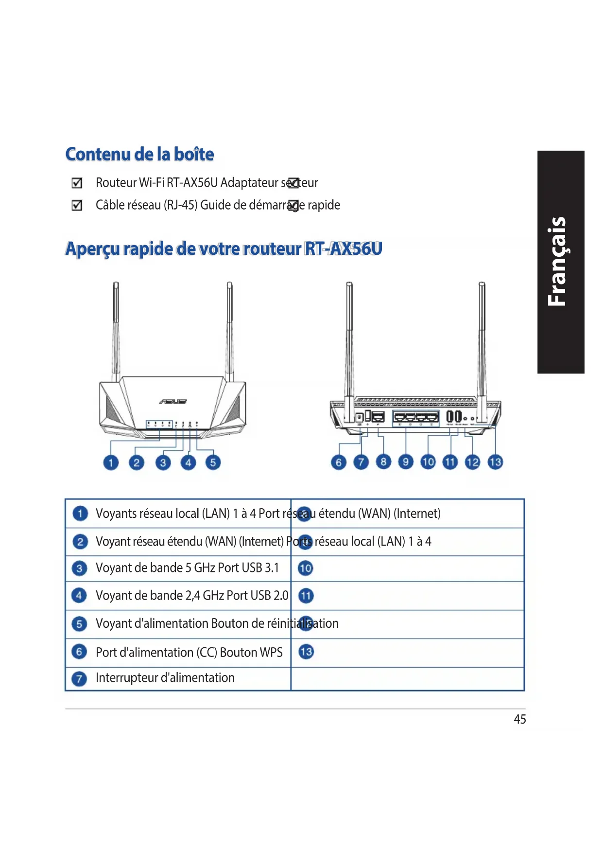 - Võrgus loetava kasutujuhendi saate saidilt https://www.asus.com/support45 Français Aperçu rapide de votre routeur RT-AX56U Voyants réseau local (LAN) 1 à 4 Port réseau étendu (WAN) (Internet) Voyant réseau étendu (WAN) (Internet) Ports réseau local (LAN) 1 à 4 Voyant de bande 5 GHz Port USB 3.1 Voyant de bande 2,4 GHz Port USB 2.0 Voyant d'alimentation Bouton de réinitialisation Port d'alimentation (CC) Bouton WPS Interrupteur d'alimentation Contenu de la boîte Routeur Wi-Fi RT-AX56U Adaptateur secteur Câble réseau (RJ-45) Guide de démarrage rapide46 Français Placez le routeur Wi-Fi Pour optimiser la transmission du signal Wi-Fi entre votre routeur et les périphériques réseau y étant connectés, veuillez vous assurer des points suivants :