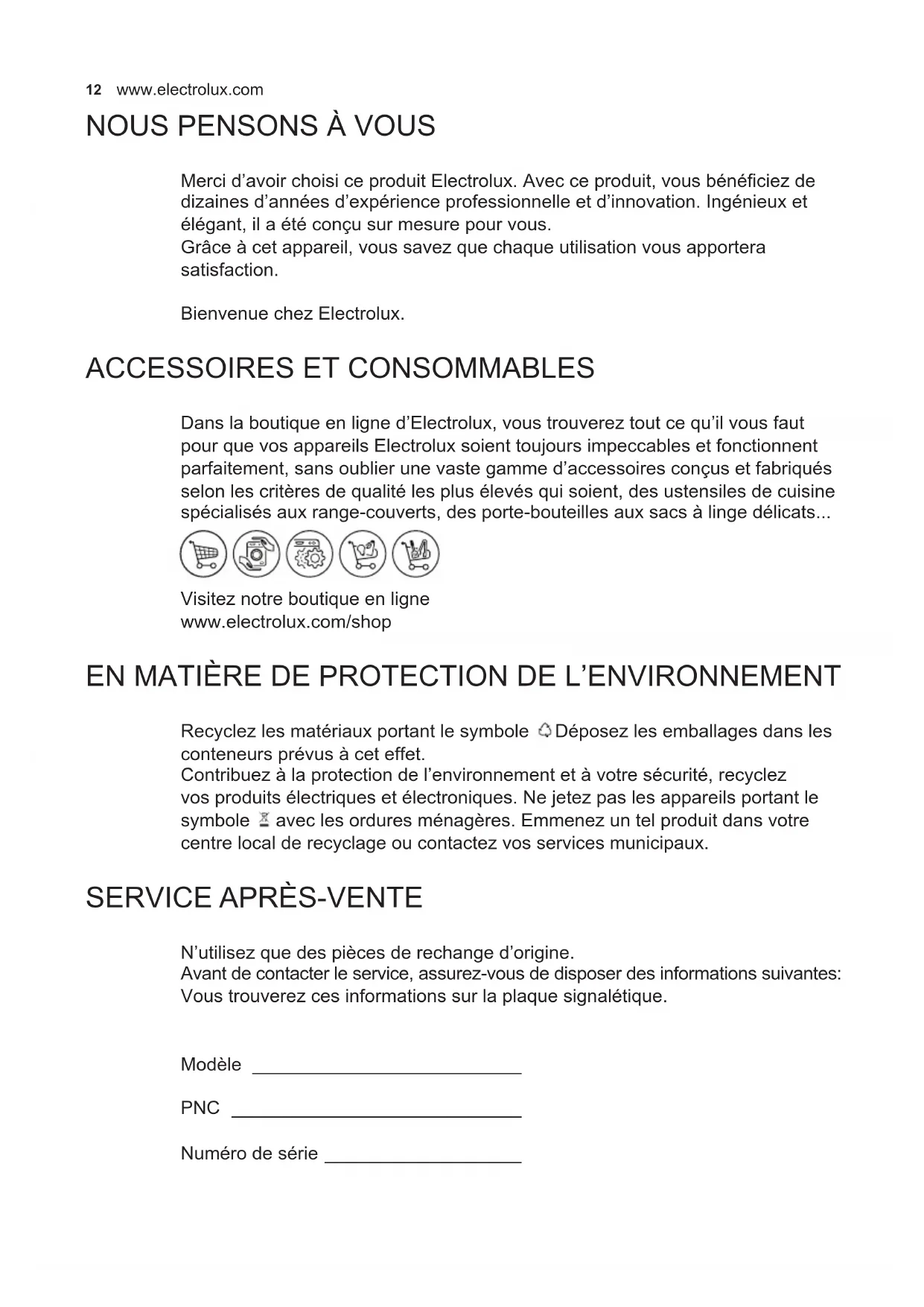 Dans la boutique en ligne d’Electrolux, vous trouverez tout ce qu’il vous faut pour que vos appareils Electrolux soient toujours impeccables et fonctionnent parfaitement, sans oublier une vaste gamme d’accessoires conçus et fabriqués selon les critères de qualité les plus élevés qui soient, des ustensiles de cuisine spécialisés aux range-couverts, des porte-bouteilles aux sacs à linge délicats... Visitez notre boutique en ligne www.electrolux.com/shop EN MATIÈRE DE PROTECTION DE L’ENVIRONNEMENT Recyclez les matériaux portant le symbole . Déposez les emballages dans les conteneurs prévus à cet effet. Contribuez à la protection de l’environnement et à votre sécurité, recyclez vos produits électriques et électroniques. Ne jetez pas les appareils portant le symbole avec les ordures ménagères. Emmenez un tel produit dans votre centre local de recyclage ou contactez vos services municipaux.