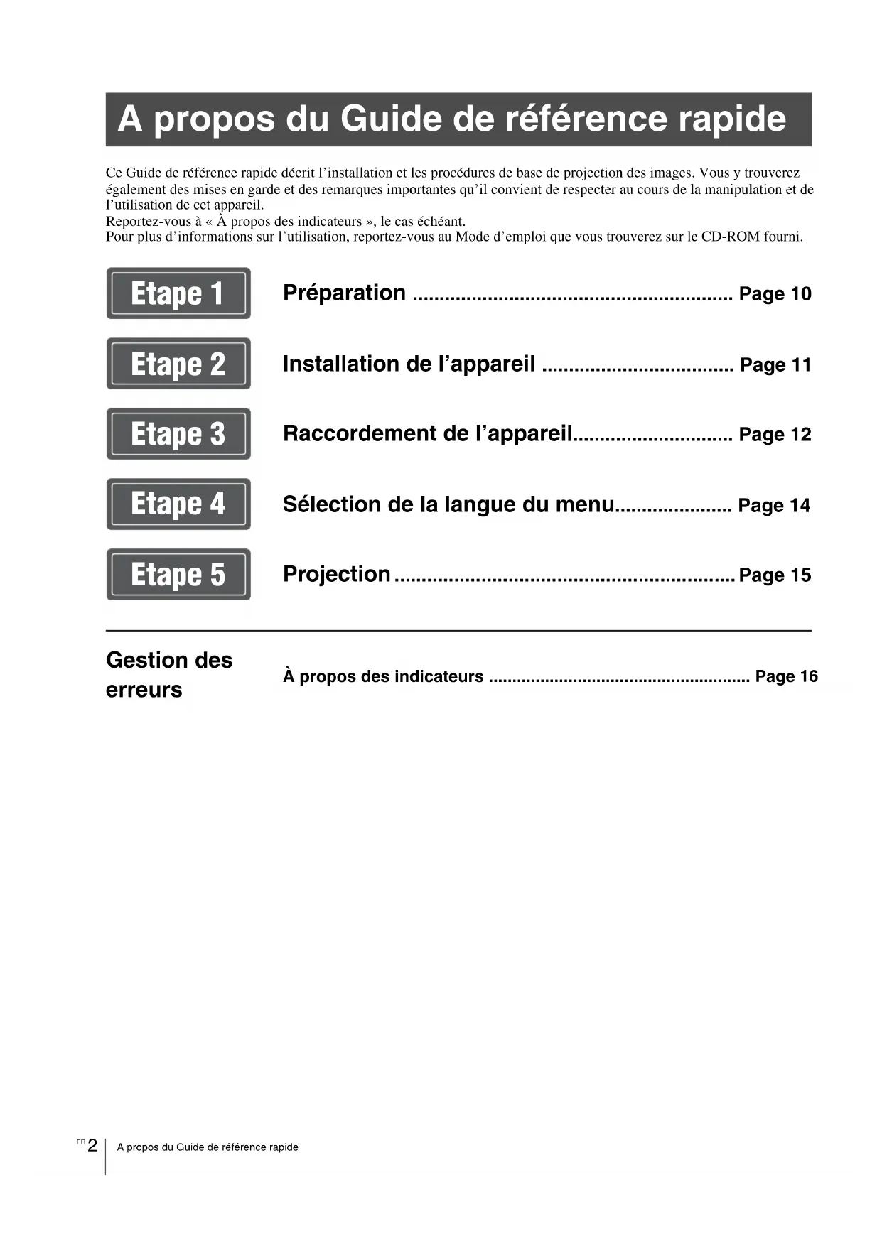Ce Guide de référence rapide décrit l’installation et les procédures de base de projection des images. Vous y trouverez également des mises en garde et des remarques importantes qu’il convient de respecter au cours de la manipulation et de l’utilisation de cet appareil.Reportez-vous à « À propos des indicateurs », le cas échéant.Pour plus d’informations sur l’utilisation, reportez-vous au Mode d’emploi que vous trouverez sur le CD-ROM fourni. A propos du Guide de référence rapide Préparation ............................................................ Page 10 Installation de l’appareil .................................... Page 11 Raccordement de l’appareil.............................. Page 12 Sélection de la langue du menu...................... Page 14 Projection ............................................................... Page 15 Gestion des erreurs À propos des indicateurs ........................................................ Page 16 Etape 1 Etape 2 Etape 3 Etape 4 Etape 5AVERTISSEMENT