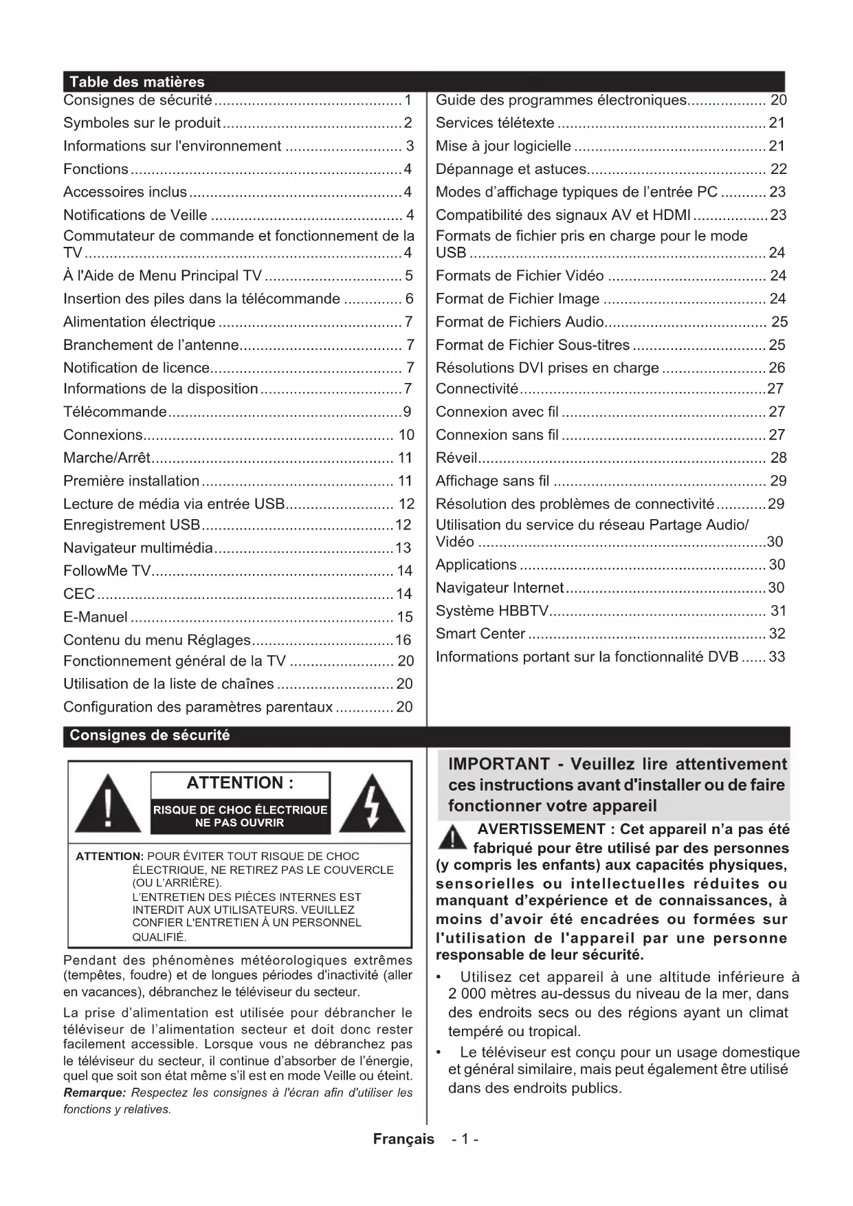 - (requis pour les fonctions d’enregistrement USB, si disponibles) Remarques : Pour les appareils Android, les dimensions d'écran Normal (mdpi), Large (hdpi) et Extra Large (xhdpi) sont prises en charges. Les appareils avec des écrans de 3” ou plus petits ne sont pas pris en charge. Pour les appareils iOS, toutes les dimensions d'écran sont prises en charge. L'interface utilisateur de l'application Smart Center peut changer en fonction de la version installée sur votre appareil. Informations portant sur la fonctionnalité DVB L’utilisation de ce récepteur DVB est indiquée uniquement dans le pays pour lequel il a été fabriqué. Bien que ce récepteur DVB soit conforme aux spécifications DVB les plus récentes au moment de sa fabrication, nous ne saurions en garantir la compatibilité avec les transmissions DVB ultérieures en raison des changements susceptibles d’intervenir dans les signaux et technologies de diffusion. Certaines fonctions du téléviseur numérique peuvent ne pas être disponibles dans tous les pays. Nous nous efforçons chaque jour à améliorer davantage la qualité de nos produits ; par conséquent, leurs spécifications peuvent changer sans préavis. Pour savoir où acheter des accessoires, veuillez contacter le magasin dans lequel vous avez acheté votre équipement.English - 1 - Safety Information Contents Safety Information p. 1