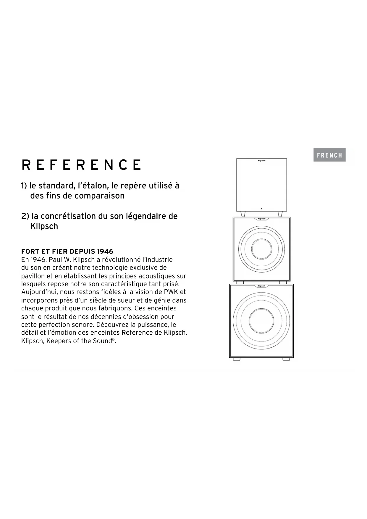 En 1946, Paul W. Klipsch a révolutionné l’industrie du son en créant notre technologie exclusive de pavillon et en établissant les principes acoustiques sur lesquels repose notre son caractéristique tant prisé. Aujourd’hui, nous restons fidèles à la vision de PWK et incorporons près d’un siècle de sueur et de génie dans chaque produit que nous fabriquons. Ces enceintes sont le résultat de nos décennies d’obsession pour cette perfection sonore. Découvrez la puissance, le détail et l’émotion des enceintes Reference de Klipsch. Klipsch, Keepers of the Sound