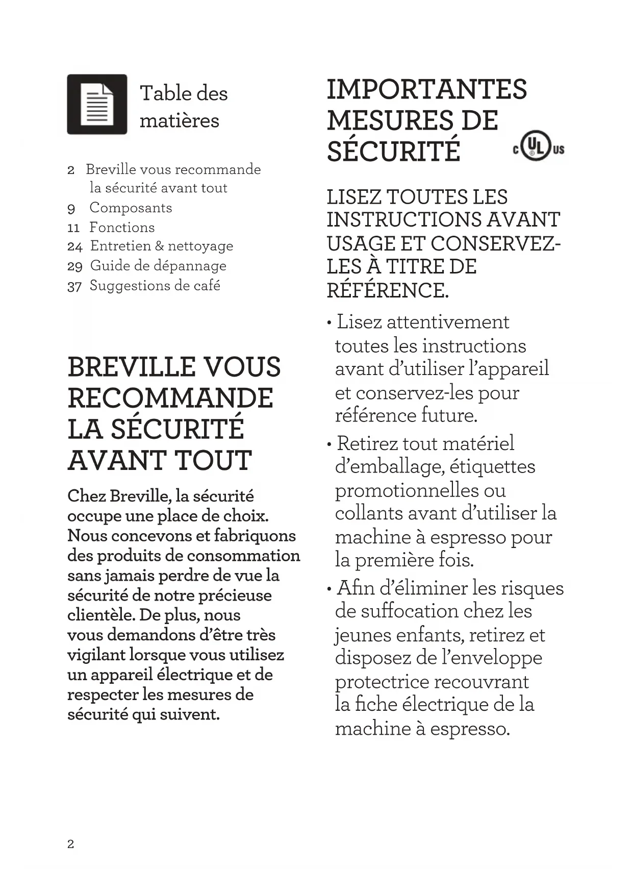 - Afin d’éliminer les risques de suocation chez les jeunes enfants, retirez et disposez de l’enveloppe protectrice recouvrant la fiche électrique de la machine à espresso. Table des matières 2 Breville vous recommande la sécurité avant tout 9 Composants 11 Fonctions 24 Entretien & nettoyage 29 Guide de dépannage 37 Suggestions de café3 FR-CA