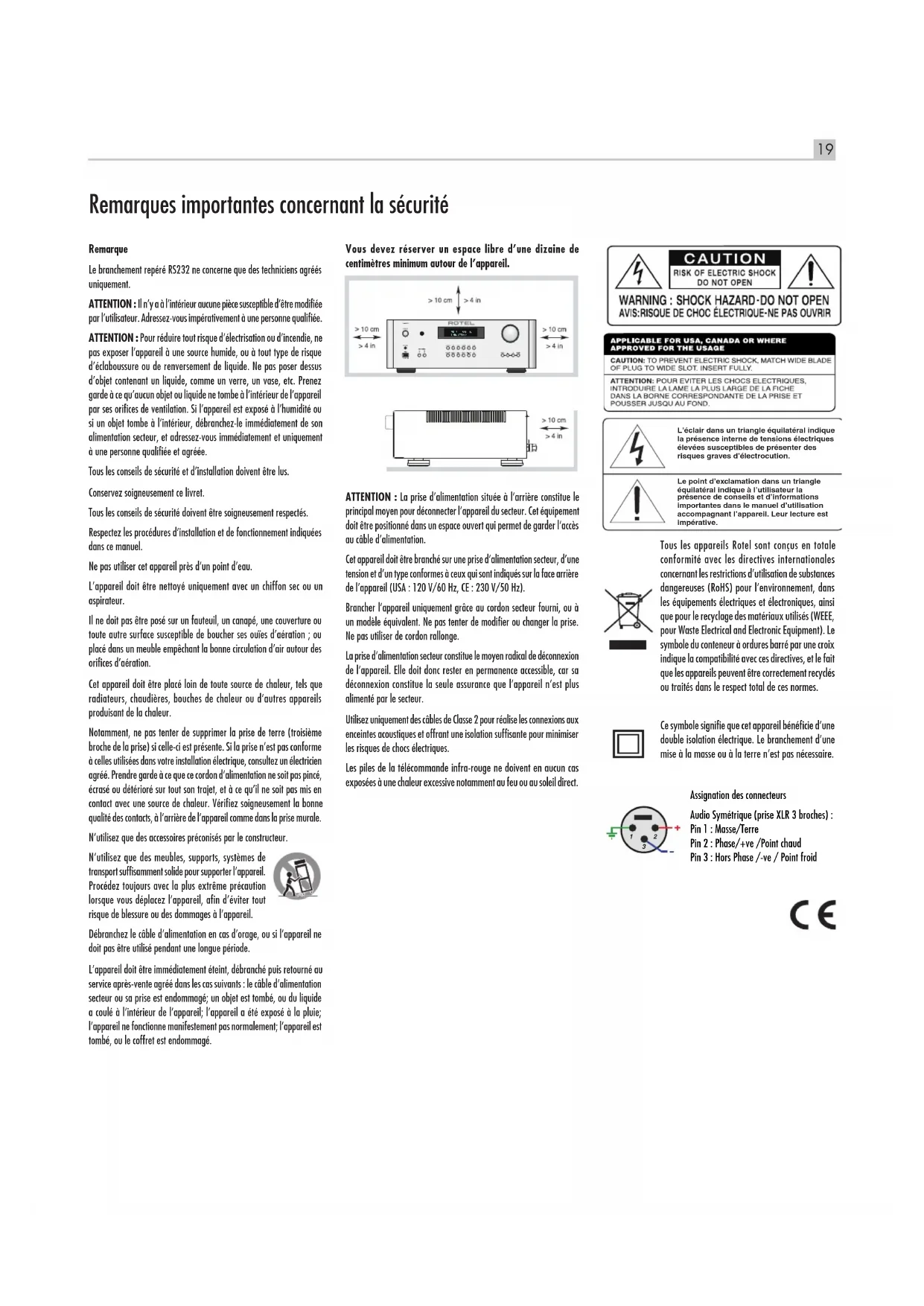 - Assignation des connecteurs Audio Symétrique (prise XLR 3 broches) : Pin 1 : Masse/Terre Pin 2 : Phase/+ve /Point chaud Pin 3 : Hors Phase /‑ve / Point froid20 RA‑1572 Amplicateur Stéréo Intégré A propos de Rotel Notre histoire commence il y a environ 50 ans. Depuis, au l des années, nous avons reçu des centaines de prix et de récompenses, et satisfait des centaines de milliers de personnes – comme vous ! Rotel a été fondée par une famille passionnée de musique, qui a décidé de fabriquer des maillons Haute Fidélité sans compromis aucun. Depuis sa création, cette passion est restée intacte, et cette famille s’est xée comme objectif de proposer à tous les audiophiles et mélomanes les meilleurs appareils possibles, quel que soit leur budget. Une volonté partagée par tous les employés de Rotel. Les ingénieurs Rotel travaillent comme une équipe très soudée, écoutant, peaunant chaque nouveau modèle jusqu’à ce qu’il atteigne exactement leurs standards – très élevés – de musicalité. Ils sont libres de choisir des composants en provenance du monde entier, an de concevoir le meilleur produit possible. C’est ainsi que vous trouverez dans nos appareils des condensateurs d’origine britannique ou allemande, des transistors japonais ou américains, tandis que les transformateurs toriques sont toujours fabriqués dans nos propres usines Rotel. Nous sommes tous concernés par la qualité de l’environnement. Et, comme de plus en plus de produits électroniques sont fabriqués puis éliminés quelques années plus tard, il est désormais essentiel qu’un constructeur fabrique tous ses produits en veillant à ce qu’ils aient un impact minimum sur la planète. Chez Rotel, nous sommes très ers d’apporter notre pierre à ce nouvel édice. Nous avons réduit la teneur en plomb de nos électroniques, en utilisant notamment des composants et une soudure spéciale ROHS. Nos ingénieurs travaillent en permanence pour améliorer le rendement des alimentations de puissance sans compromettre leur qualité. C’est ainsi qu’en mode Standby, les appareils Rotel consomment moins pour se conformer aux exigences de la « Standby Power Consumption » qui limite la consommation en veille des appareils électroniques. L’usine Rotel participe également de façon active à la protection de l’environnement au travers d’un processus de fabrication général amélioré et toujours plus écologique et plus propre. Tous les membres de l’équipe Rotel vous remercient pour l’achat de cet appareil. Nous sommes persuadés qu’il vous offrira de nombreuses années d’intense plaisir musical. Sommaire Figure 1 : Commandes et Branchements 3 Figure 2 : Télécommande infrarouge RR-AX93 4 Figure 3 : Branchements des entrées analogiques et sorties enceintes acoustiques 5 Figure 4 : Branchements des entrées numériques 6 Figure 5 : Entrées symétriques (XLR) connexion 7 Figure 6 : Entrée USB en face avant 7 Figure 7 : Branchements Rotel Link et trigger 12 V 8 Remarques importantes 9 Remarques importantes concernant la sécurité p. 19