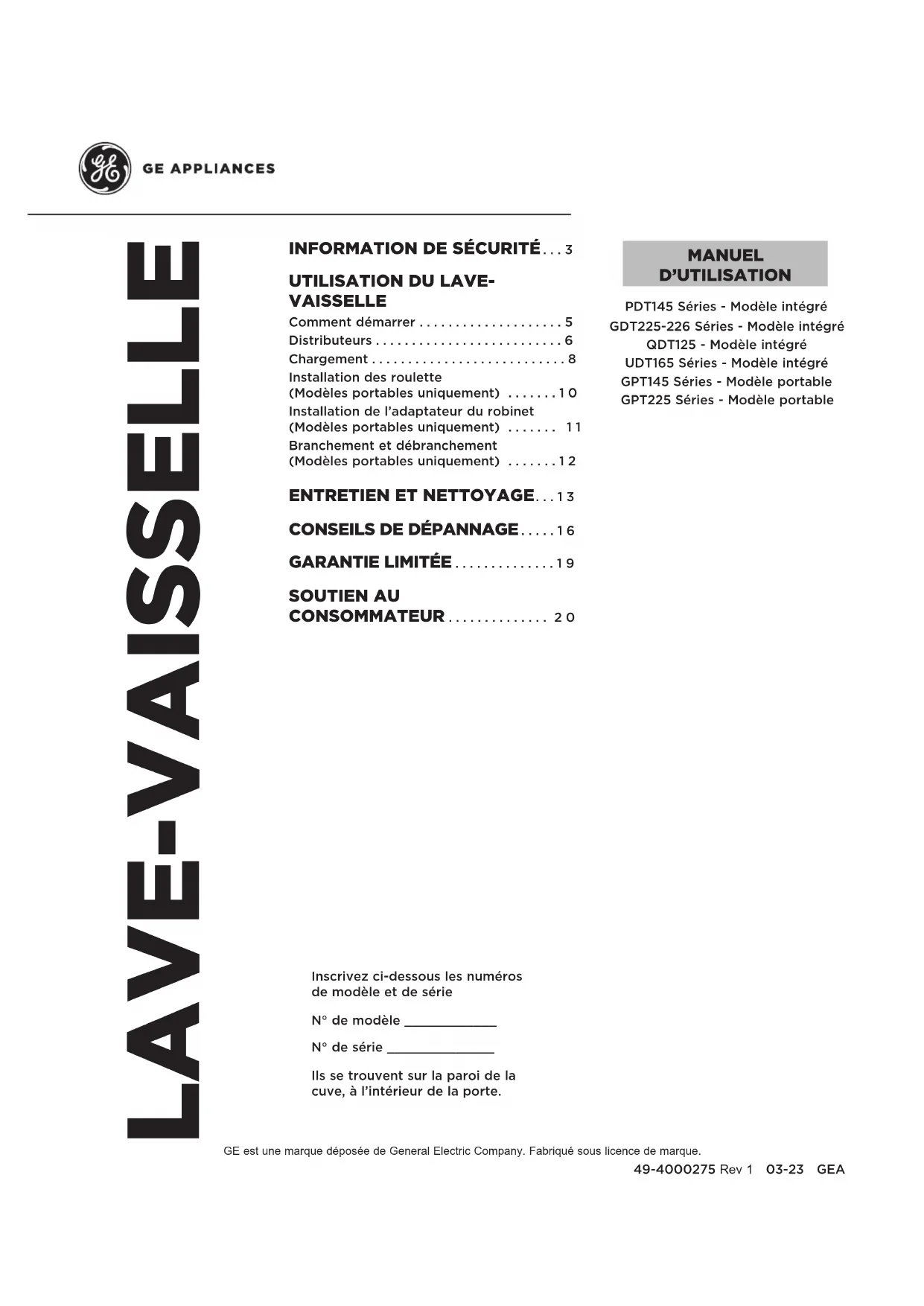 SOUTIEN AU CONSOMMATEUR .............. 20 PDT145 Séries - Modèle intégré GDT225-226 Séries - Modèle intégré QDT125 - Modèle intégré UDT165 Séries - Modèle intégré GPT145 Séries - Modèle portable GPT225 Séries - Modèle portable 49-4000275 Rev 1 03-23 GEA2 49-4000275 Rev 1 NOUS VOUS REMERCIONS D’ACCUEILLIR GE APPLIANCES CHEZ VOUS Que vous ayez grandi avec GE Appliances ou qu’il s’agisse de votre première acquisition, nous sommes heureux de vous accueillir dans notre famille. Nous sommes fiers du savoir-faire, de l’innovation et de l’esthétique qui composent chaque appareil GE Appliances, et nous pensons que vous le serez aussi. Dans cette optique, nous vous rappelons que l’enregistrement de votre électroménager vous assure la communication de renseignements importants sur le produit et la garantie lorsque vous en avez besoin. Enregistrez votre électroménager GE en ligne dès maintenant. Des sites Web et des numéros de téléphone utiles figurent dans la section Soutien au consommateur de ce manuel d’utilisation. Vous pouvez aussi poster la fiche de garantie préimprimée incluse dans l’emballage.49-4000275 Rev 1 3