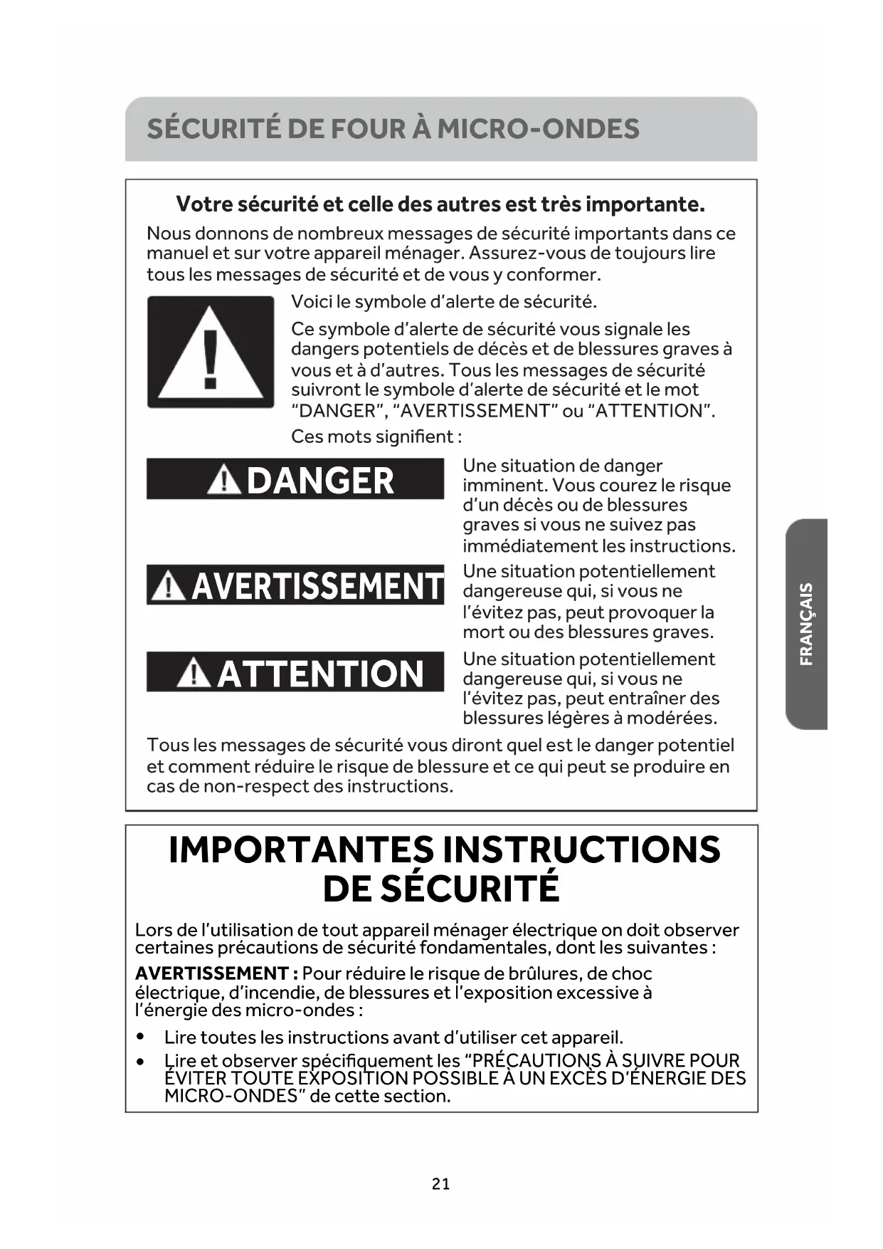 Votre sécurité et celle des autres est très importante. DANGER AVERTISSEMENT ATTENTION Voici le symbole d’alerte de sécurité. Ce symbole d’alerte de sécurité vous signale les dangers potentiels de décès et de blessures graves à vous et à d’autres. Tous les messages de sécurité suivront le symbole d’alerte de sécurité et le mot “DANGER”, “AVERTISSEMENT” ou “ATTENTION”. Ces mots signifient : Une situation de danger imminent. Vous courez le risque d’un décès ou de blessures graves si vous ne suivez pas immédiatement les instructions. Une situation potentiellement dangereuse qui, si vous ne l’évitez pas, peut provoquer la mort ou des blessures graves. Une situation potentiellement dangereuse qui, si vous ne l’évitez pas, peut entraîner des blessures légères à modérées. Tous les messages de sécurité vous diront quel est le danger potentiel et comment réduire le risque de blessure et ce qui peut se produire en cas de non-respect des instructions. Nous donnons de nombreux messages de sécurité importants dans ce manuel et sur votre appareil ménager. Assurez-vous de toujours lire tous les messages de sécurité et de vous y conformer. IMPORTANTES INSTRUCTIONS