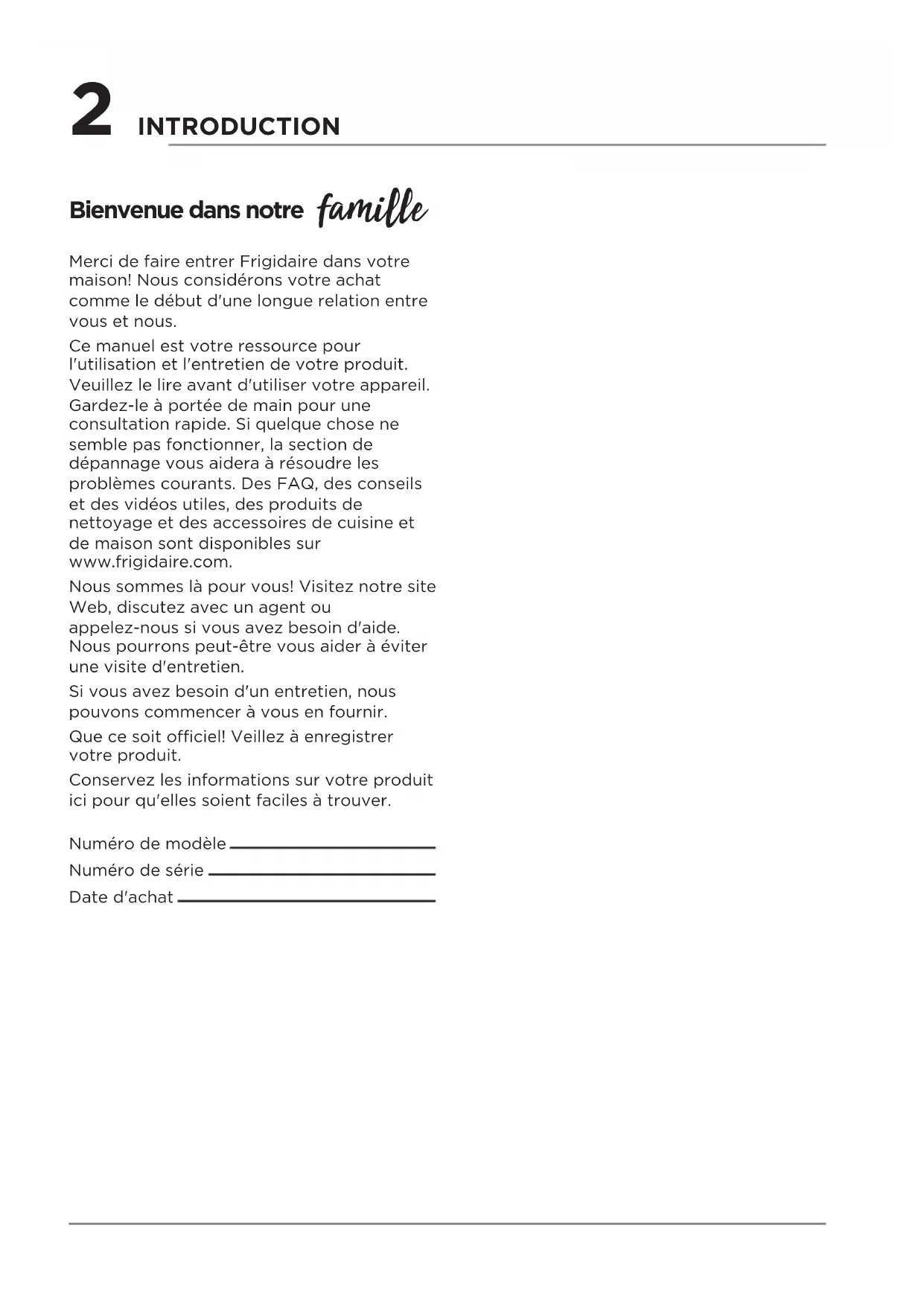 - Garantie Limité D’appareil Principale INTRODUCTION Bienvenue dans notre famie Numéro de modèle Numéro de série Date d'achat Merci de faire entrer Frigidaire dans votre maison! Nous considérons votre achat comme le début d'une longue relation entre vous et nous. Ce manuel est votre ressource pour l'utilisation et l'entretien de votre produit. Veuillez le lire avant d'utiliser votre appareil. Gardez-le à portée de main pour une consultation rapide. Si quelque chose ne semble pas fonctionner, la section de dépannage vous aidera à résoudre les problèmes courants. Des FAQ, des conseils et des vidéos utiles, des produits de nettoyage et des accessoires de cuisine et de maison sont disponibles sur www.frigidaire.com. Nous sommes là pour vous! Visitez notre site Web, discutez avec un agent ou appelez-nous si vous avez besoin d'aide. Nous pourrons peut-être vous aider à éviter une visite d'entretien. Si vous avez besoin d'un entretien, nous pouvons commencer à vous en fournir. Que ce soit ociel! Veillez à enregistrer votre produit. Conservez les informations sur votre produit ici pour qu'elles soient faciles à trouver.3 Pour votre sécurité p. 132