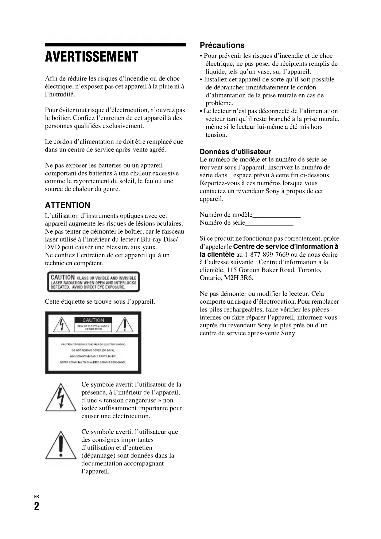 AVERTISSEMENT Afin de réduire les risques d’incendie ou de choc électrique, n’exposez pas cet appareil à la pluie ni à l’humidité. Pour éviter tout risque d’électrocution, n’ouvrez pas le boîtier. Confiez l’entretien de cet appareil à des personnes qualifiées exclusivement. Le cordon d’alimentation ne doit être remplacé que dans un centre de service après-vente agréé. Ne pas exposer les batteries ou un appareil comportant des batteries à une chaleur excessive comme le rayonnement du soleil, le feu ou une source de chaleur du genre. ATTENTION L’utilisation d’instruments optiques avec cet appareil augmente les risques de lésions oculaires. Ne pas tenter de démonter le boîtier, car le faisceau laser utilisé à l’intérieur du lecteur Blu-ray Disc/ DVD peut causer une blessure aux yeux. Ne confiez l’entretien de cet appareil qu’à un technicien compétent. Cette étiquette se trouve sous l’appareil. Ce symbole avertit l’utilisateur de la présence, à l’intérieur de l’appareil, d’une « tension dangereuse » non isolée suffisamment importante pour causer une électrocution. Ce symbole avertit l’utilisateur que des consignes importantes d’utilisation et d’entretien (dépannage) sont données dans la documentation accompagnant l’appareil. Précautions