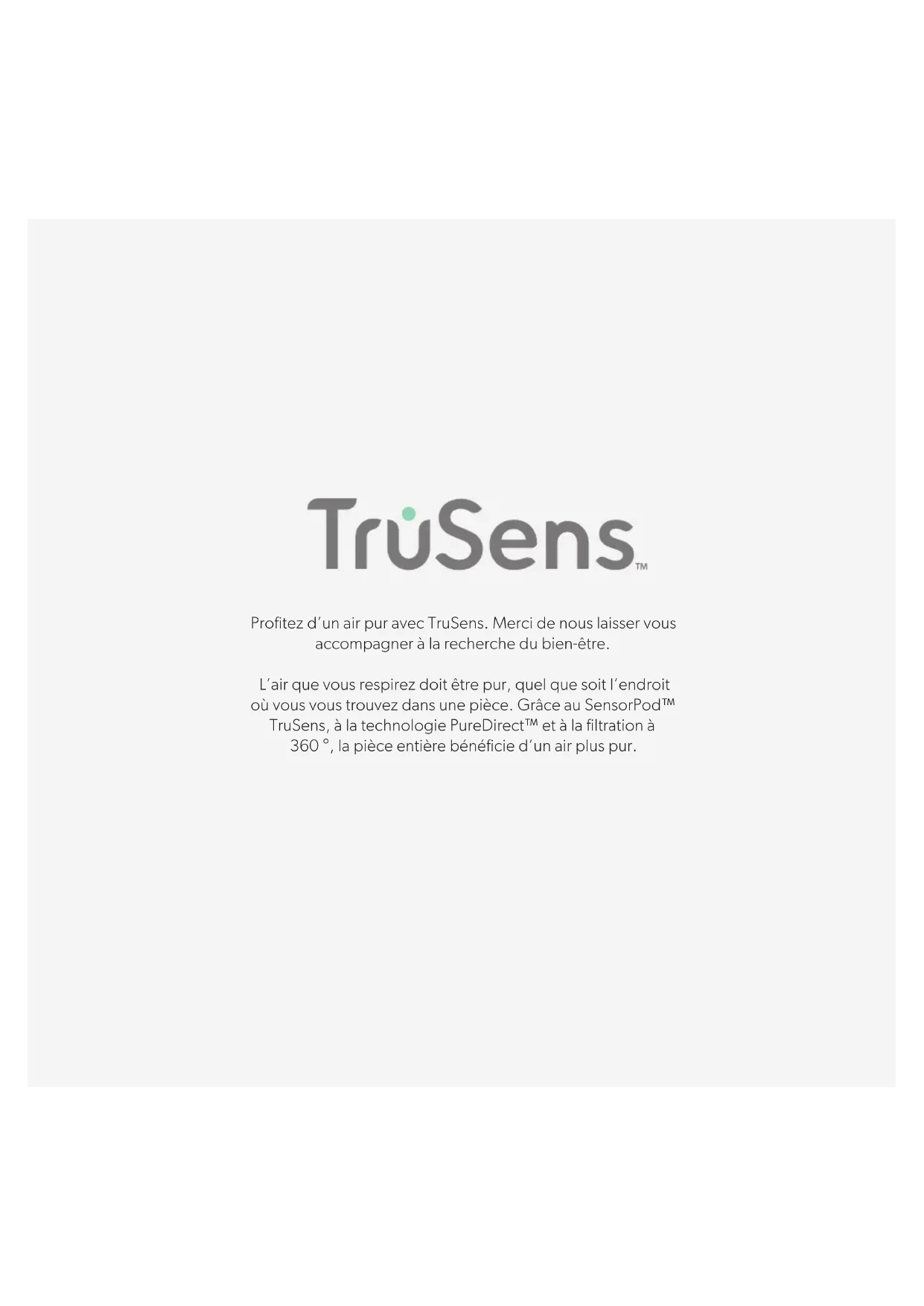 Réinitialisation des indicateurs de filtre et de lampe UV-C Les indicateurs HEPA, Carbon et UV s’allument en rouge lorsqu’il est temps de remplacer le filtre à particules, le filtre à charbon et la lampe UV-C respectivement. Pour réinitialiser un indicateur qui s’est allumé en rouge, il suffit de maintenir enfoncée la touche Reset pendant 3 secondes. Si plusieurs indicateurs se sont allumés, tapez sur la touche Reset pour sélectionner l’indicateur approprié (l’indicateur sélectionné se met à clignoter) avant de maintenir cette touche enfoncée pendant 3 secondes pour réinitialiser l’indicateur. (Voir pages 47-49 pour les instructions de remplacement. Après le remplacement d’un filtre ou de la lampe, suivez les instructions de réinitialisation d’indicateur ci-dessus). Réglages de vitesse du ventilateur Sélectionnez la vitesse du ventilateur ou le mode AUTO. En mode AUTO, le purificateur ajuste automatiquement la vitesse du ventilateur en fonction des relevés de qualité d’air du SensorPod™. (Le mode AUTO n’est disponible que lorsque le purificateur fonctionne avec le SensorPod™ et reçoit un signal.) Mode nuit L’affichage lumineux s’éteint sans compromettre l’efficacité du purificateur – à utiliser pendant le sommeil. Il suffit d’appuyer de nouveau sur cette touche pour réafficher toutes les fonctionnalités. Mode minuterie Le purificateur s’éteint automatiquement au bout de 2, 4, 8 ou 12 heures. Pour annuler cette minuterie, appuyez simplement sur la touche jusqu’à la disparition de l’affichage du réglage de la minuterie. (Voir page 49 pour les instructions). Mode UV La lampe UV-C située dans le logement du filtre du purificateur est activée lorsque le symbole est blanc. Ce symbole s’allume en rouge lorsque la lampe UV-C a besoin d’être remplacée. Bouton marche/arrêt45 AFFICHAGE DE LA QUALITÉ DE L’AIR Feedback en temps réel Le SensorPod™ révolutionnaire évalue la qualité de l’air en mesurant à la fois les particules petites (2,5 microns) et plus larges (10 microns). Il mesure la qualité générale de l’air à l’aide d’un algorithme propriétaire qui détecte les augmentations véritables de polluants sans réagir de manière excessive lorsque quelqu’un entre dans la pièce ou s’y assoit. L’affichage lumineux à code couleur indique si la qualité de l’air est bonne, moyenne ou mauvaise, tandis qu’une valeur numérique donne une information plus précise. En mode AUTO, le purificateur ajuste automatiquement la vitesse du ventilateur en fonction de ces relevés de la qualité de l’air. TruSens utilise l’indice de la qualité de l’air (1-500) créé par l’Environmental Protection Agency (EPA) des États-Unis. BONNE BLEU | 0 - 50 MOYENNE JAUNE | 50 - 100 MAUVAISE ROUGE | 100 - 50046 Entrée d’air 360° Renouvellement de l’air 2 fois par heure 35 m² Type de dispersion de l’air PureDirect