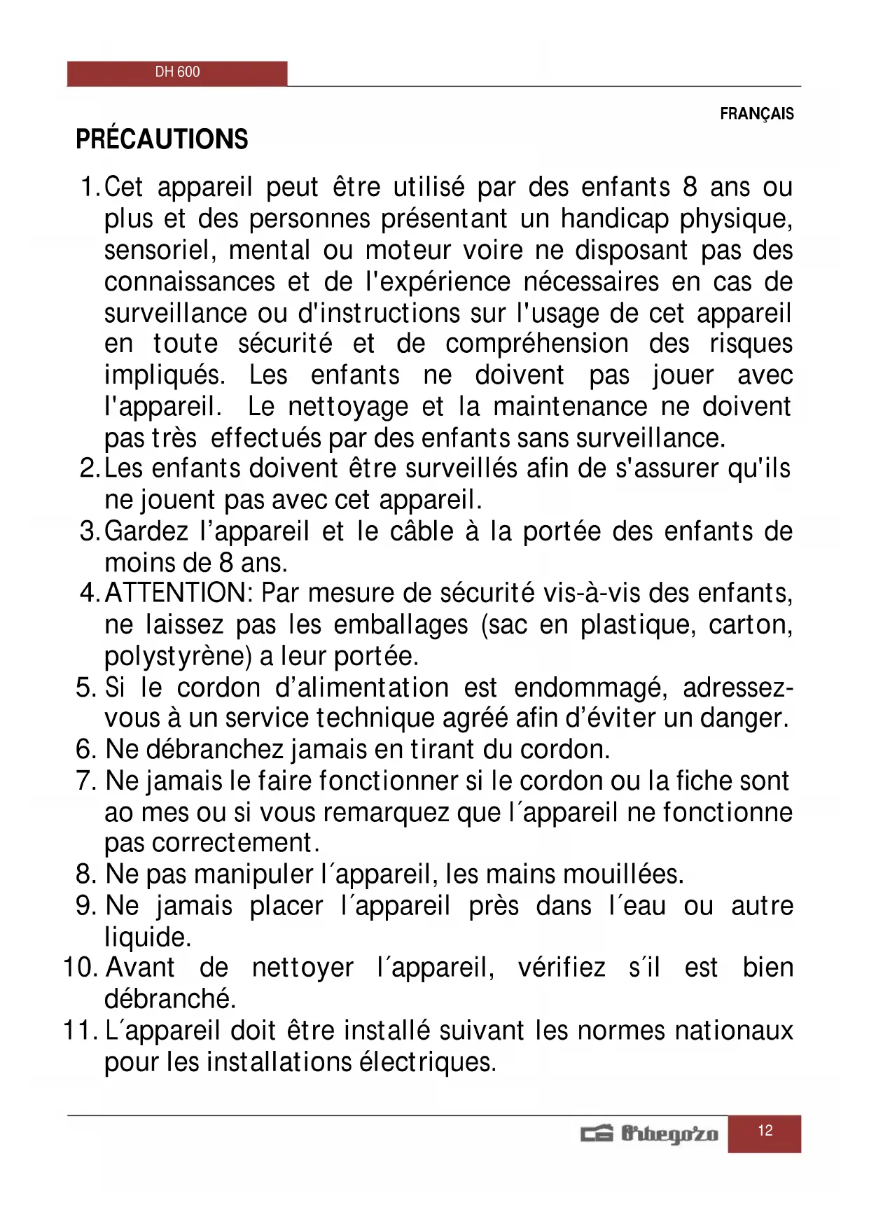Retrouvez gratuitement la notice de l'appareil DH 600 Orbegozo au format PDF.
