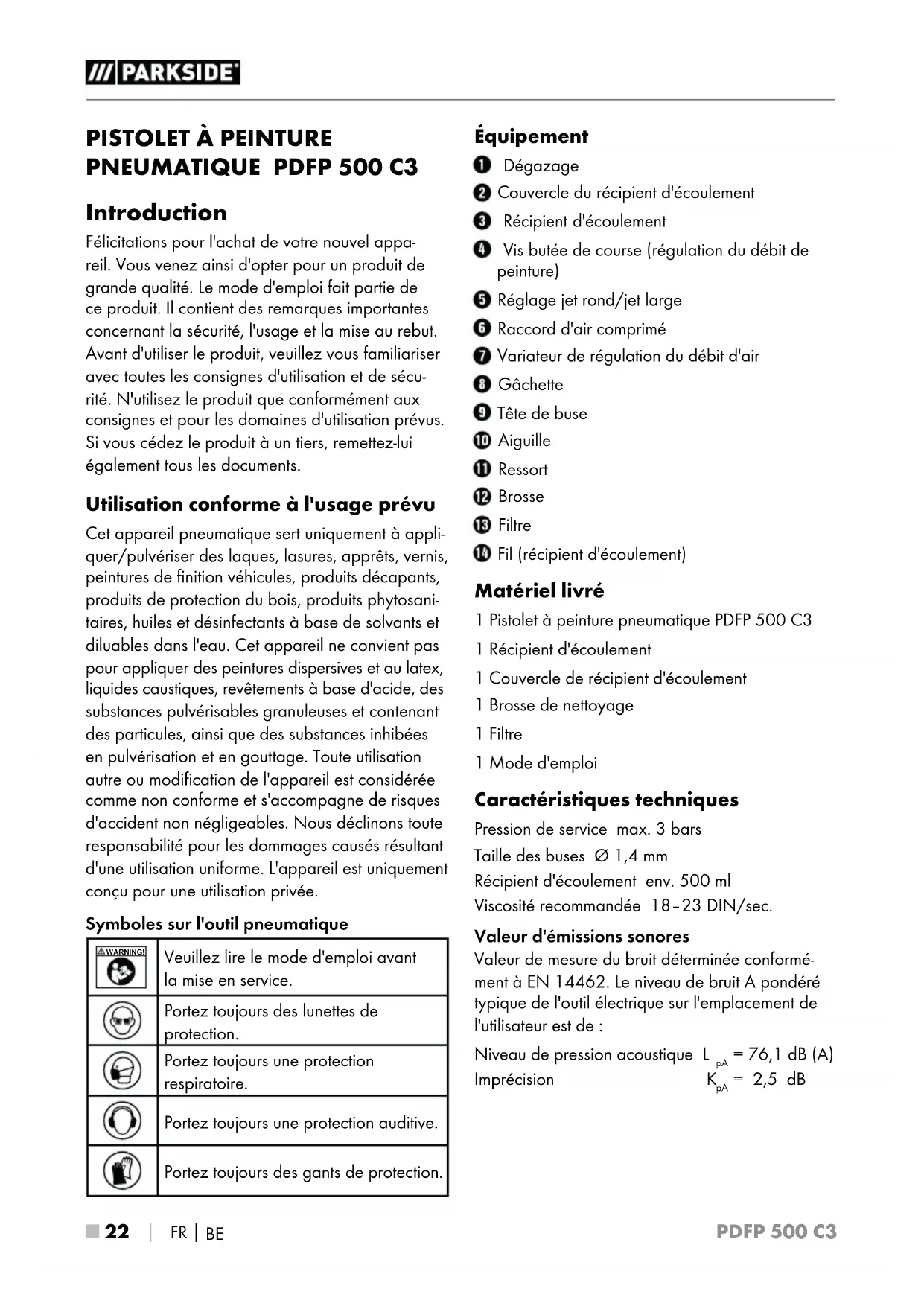 Introduction Félicitations pour l'achat de votre nouvel appa- reil. Vous venez ainsi d'opter pour un produit de grande qualité. Le mode d'emploi fait partie de ce produit. Il contient des remarques importantes concernant la sécurité, l'usage et la mise au rebut. Avant d'utiliser le produit, veuillez vous familiariser avec toutes les consignes d'utilisation et de sécu- rité. N'utilisez le produit que conformément aux consignes et pour les domaines d'utilisation prévus. Si vous cédez le produit à un tiers, remettez-lui également tous les documents. Utilisation conforme à l'usage prévu Cet appareil pneumatique sert uniquement à appli- quer/pulvériser des laques, lasures, apprêts, vernis, peintures de finition véhicules, produits décapants, produits de protection du bois, produits phytosani- taires, huiles et désinfectants à base de solvants et diluables dans l'eau. Cet appareil ne convient pas pour appliquer des peintures dispersives et au latex, liquides caustiques, revêtements à base d'acide, des substances pulvérisables granuleuses et contenant des particules, ainsi que des substances inhibées en pulvérisation et en gouttage. Toute utilisation autre ou modification de l'appareil est considérée comme non conforme et s'accompagne de risques d'accident non négligeables. Nous déclinons toute responsabilité pour les dommages causés résultant d'une utilisation uniforme. L'appareil est uniquement conçu pour une utilisation privée. Symboles sur l'outil pneumatique WARNING! Veuillez lire le mode d'emploi avant la mise en service. Portez toujours des lunettes de protection. Portez toujours une protection respiratoire. Portez toujours une protection auditive. Portez toujours des gants de protection. Équipement Dégazage Couvercle du récipient d'écoulement Récipient d'écoulement Vis butée de course (régulation du débit de peinture) Réglage jet rond/jet large Raccord d'air comprimé Variateur de régulation du débit d'air Gâchette Tête de buse Aiguille Ressort Brosse Filtre Fil (récipient d'écoulement) Matériel livré 1 Pistolet à peinture pneumatique PDFP 500 C3 1 Récipient d'écoulement 1 Couvercle de récipient d'écoulement 1 Brosse de nettoyage 1 Filtre 1 Mode d'emploi Caractéristiques techniques Pression de service max. 3 bars Taille des buses Ø 1,4 mm Récipient d'écoulement env. 500 ml Viscosité recommandée 18–23 DIN/sec. Valeur d'émissions sonores Valeur de mesure du bruit déterminée conformé- ment à EN 14462. Le niveau de bruit A pondéré typique de l'outil électrique sur l'emplacement de l'utilisateur est de: Niveau de pression acoustique L