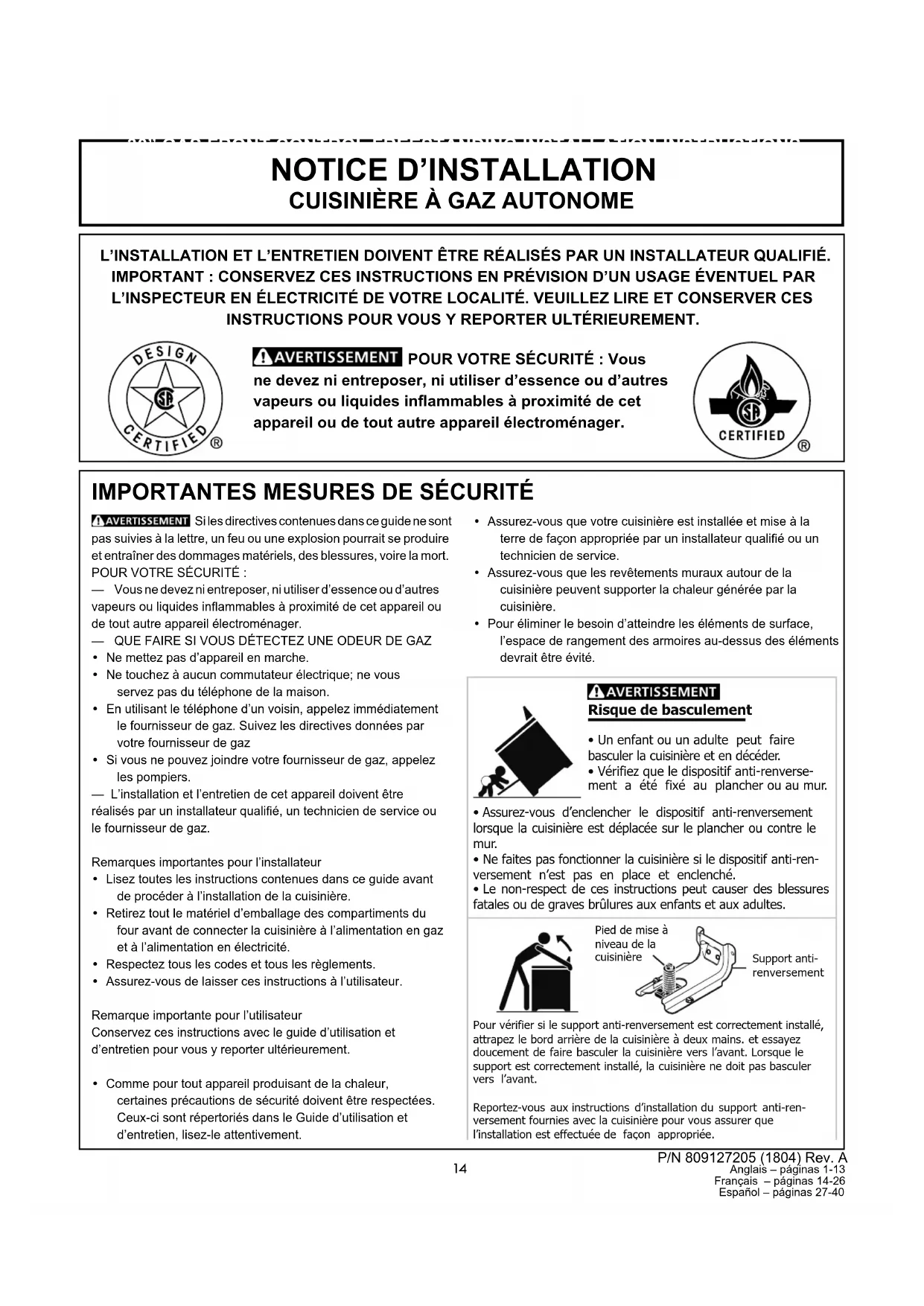 - Assurez-vous que votre cuisinière est installée et mise à la terre de façon appropriée par un installateur qualié ou un technicien de service.• Assurez-vous que les revêtements muraux autour de la cuisinière peuvent supporter la chaleur générée par la cuisinière.• Pour éliminer le besoin d’atteindre les éléments de surface, l’espace de rangement des armoires au-dessus des éléments devrait être évité.P/N 809127205 (1804) Rev. A Anglais – páginas 1-13 Français – páginas 14-26 Español – páginas 27-4015 INSTRUCTIONS D’INSTALLATION 30” CUISINIÈRE À GAZ AUTONOME