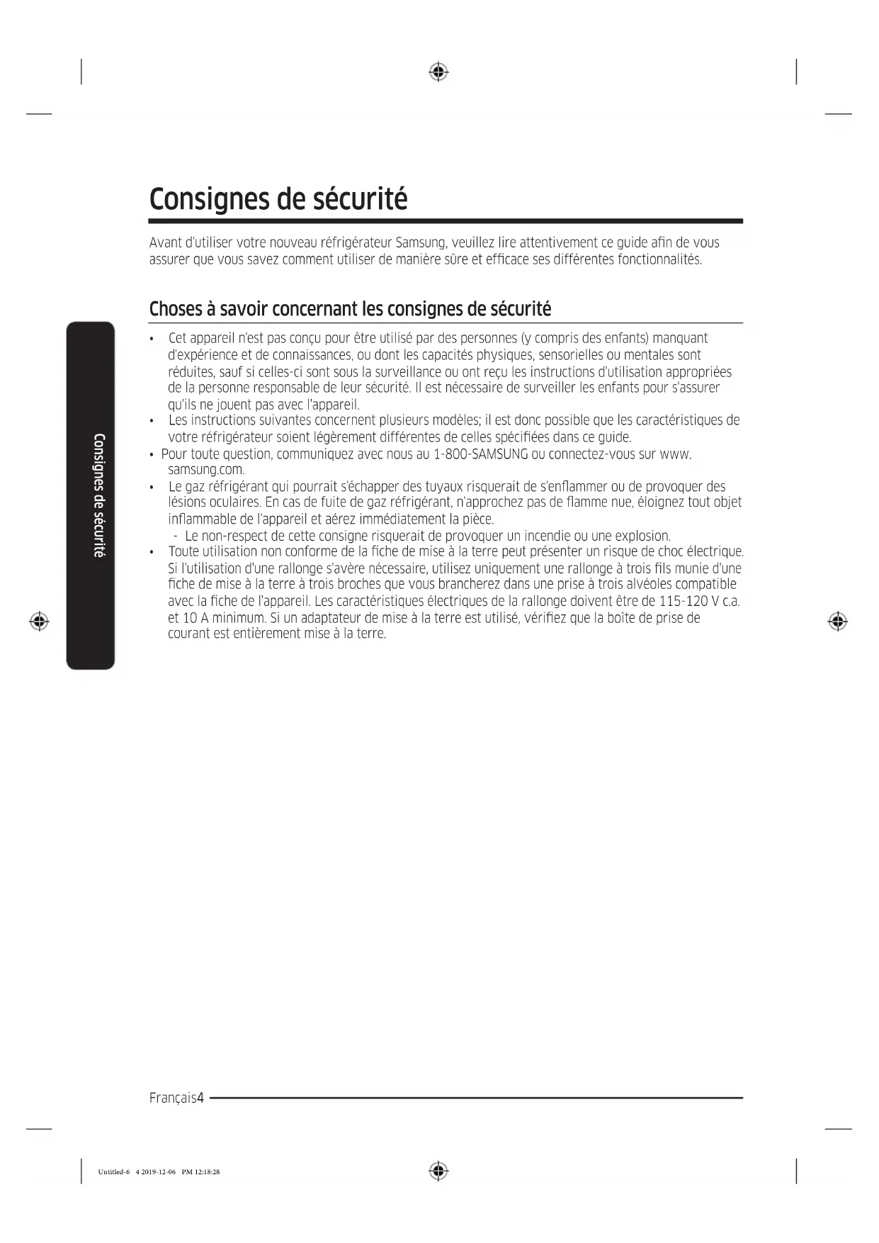 - Ne débranchez jamais le réfrigérateur en tirant sur le cordon d'alimentation. Maintenez toujours fermement la che pour la débrancher de la prise de courant. - Tout dommage causé au cordon est susceptible d'entraîner un court-circuit, un incendie et/ou un choc électrique. Untitled-6 7 2019-12-06 PM 12:18:29Consignes de sécurité Français8 Consignes de sécurité