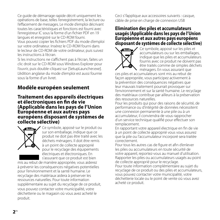 Ce guide de démarrage rapide décrit uniquement les opérations de base, telles l’enregistrement, la lecture ou l’effacement de messages. Le mode d’emploi décrivant toutes les caractéristiques et fonctions est fourni avec l’enregistreur IC sous la forme d’un fichier PDF en 19 langues et enregistré sur le CD-ROM fourni. Vous pouvez copier les fichiers PDF du mode d’emploi sur votre ordinateur. Insérez le CD-ROM fourni dans le lecteur de CD-ROM de votre ordinateur, puis suivez les instructions à l’écran. Si les instructions ne s’affichent pas à l’écran, faites un clic droit sur le CD-ROM sous Windows Explorer pour l’ouvrir, puis double-cliquez sur [SetupLauncher.exe]. L’édition anglaise du mode d’emploi est aussi fournie sous la forme d’un livret. Modèle européen seulement Traitement des appareils électriques et électroniques en fin de vie (Applicable dans les pays de l’Union Européenne et aux autres pays européens disposant de systèmes de collecte sélective) Ce symbole, apposé sur le produit ou sur son emballage, indique que ce produit ne doit pas être traité avec les déchets ménagers. Il doit être remis à un point de collecte approprié pour le recyclage des équipements électriques et électroniques. En s’assurant que ce produit est bien mis au rebut de manière appropriée, vous aiderez à prévenir les conséquences négatives potentielles pour l’environnement et la santé humaine. Le recyclage des matériaux aidera à préserver les ressources naturelles. Pour toute information supplémentaire au sujet du recyclage de ce produit, vous pouvez contacter votre municipalité, votre déchetterie ou le magasin où vous avez acheté le produit.