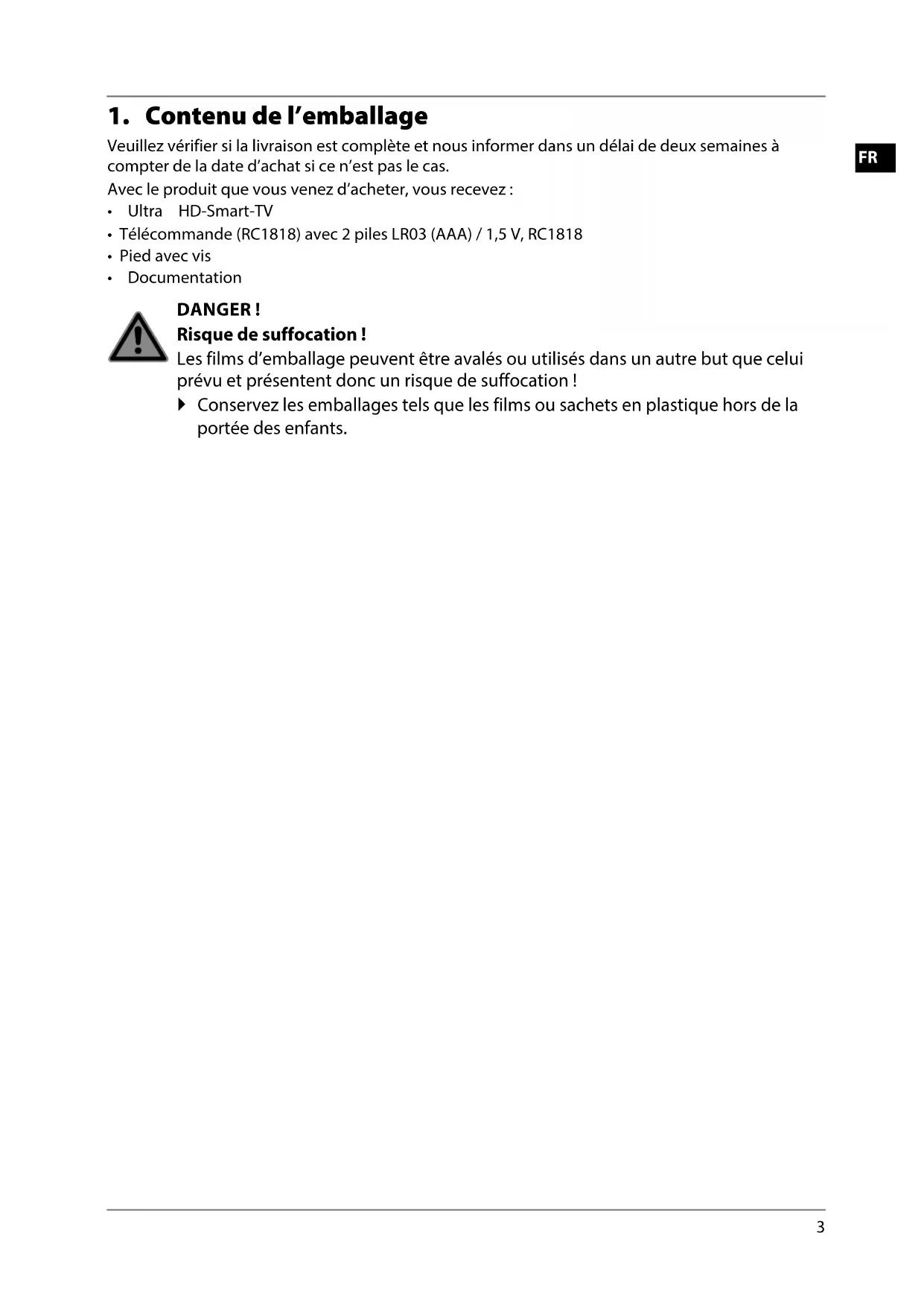 - Documentation DANGER ! Risque de suffocation! Les films d’emballage peuvent être avalés ou utilisés dans un autre but que celui prévu et présentent donc un risque de suffocation ! Conservez les emballages tels que les films ou sachets en plastique hors de la portée des enfants.4