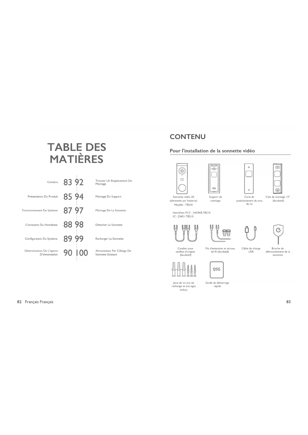 TABLE DES MATIÈRES CONTENU Pour l'installation de la sonnette vidéo QSG Sonnette vidéo 2K (alimentée par batterie)Modèle : T8210Cavalier pour carillon d'origine (facultatif)Jeux de vis (vis de rechange et ancrages inclus)Guide de démarrage rapideCarte de positionnement du trou de visBroche de débranchement de la sonnetteCale de montage 15° (facultatif)Support de montageFils d'extension et écrous de l (facultatif)Identiant FCC : 2AOKB-T8210IC : 23451-T8210Câble de charge USB Contenu Trouver Un Emplacement De Montage Présentation Du Produit Montage Du Support Fonctionnement Du Système Montage De La Sonnette Connexion Du Homebase Détacher La Sonnette Conguration Du Système Recharger La Sonnette Détermination De L'option D'alimentation Alimentation Par Câblage De Sonnette Existant84 Français Français
