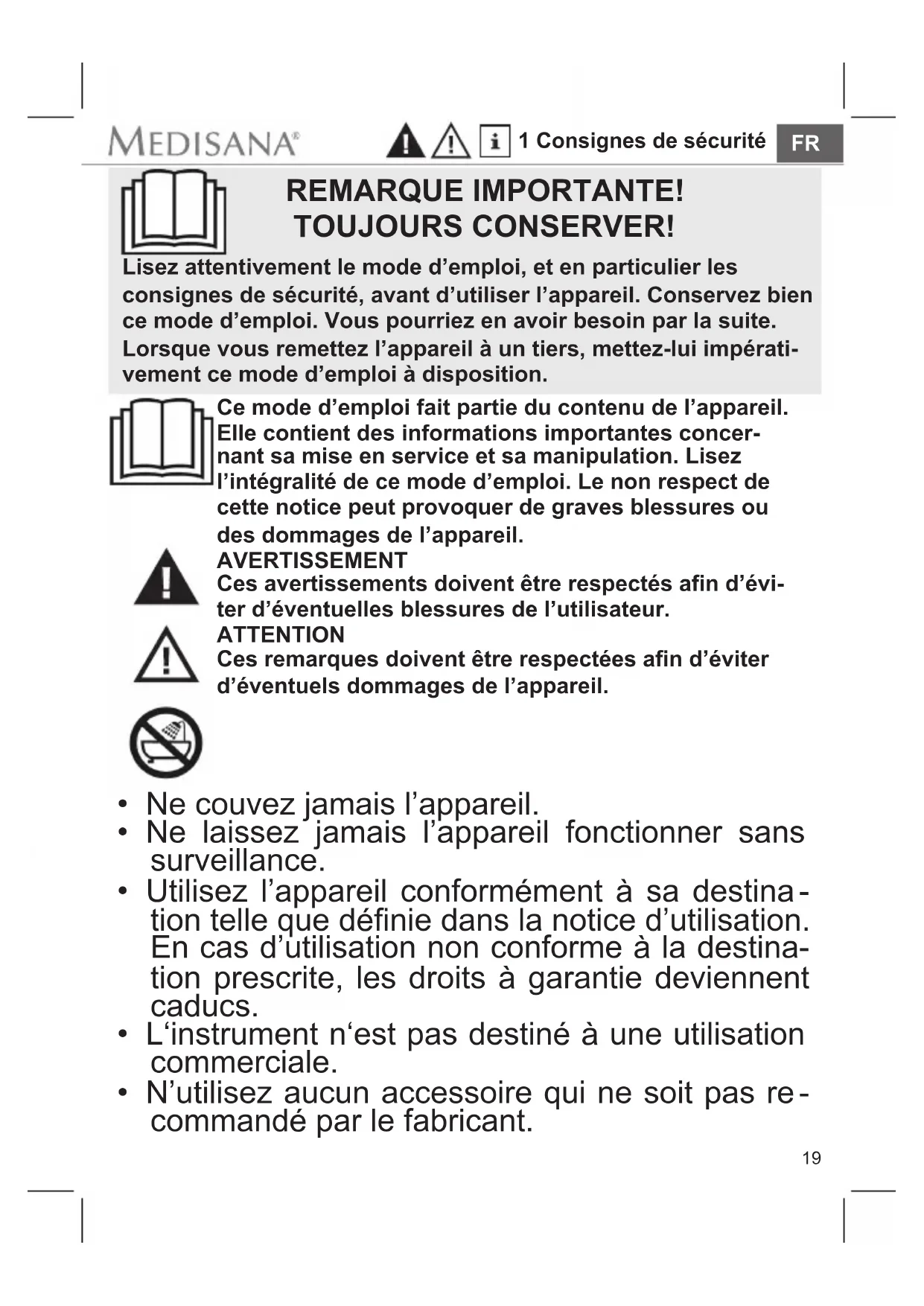 - En cas de diabète ou de toute autre maladie, demandez conseil à votre médecin de famille avant d’utiliser l’appareil. 1 Consignes de sécurité