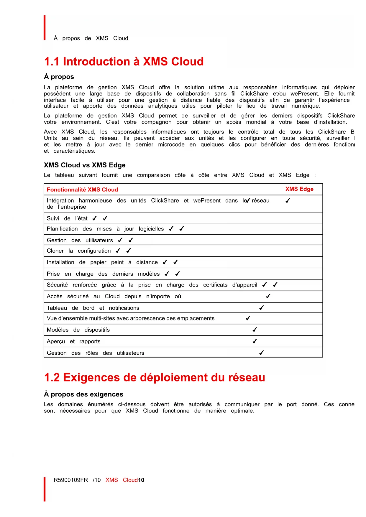 Guide de l’utilisateur ClickShare XMS CloudBarco NV Beneluxpark 21, 8500 Courtrai, Belgique www.barco.com Fabricant : Barco NV President Kennedypark 35, 8500 Courtrai - Belgique Révision du produit Firmware : 02.22.00Copyright © Tous droits réservés. Toute copie, reproduction ou traduction de ce document, en tout ou partie, est interdite. Le présent document ne peut être enregistré, transmis ou stocké dans un système de récupération sans l’autorisation écrite préalable de Barco. Marques Les noms commerciaux ainsi que les noms de produit figurant dans la présente notice d'utilisation peuvent être des marques, déposées ou non, ou droits d'auteur de leur détenteur respectif. Tous les noms de marque et les noms de produit présents dans ce document ne sont donnés qu'à titre d'exemple bien entendu il ne s'agit pas d'une approbation par Barco ni d'une promotion de ces produits ou de leur fabricant. Modifications Barco fournit ce manuel « tel quel » sans aucune garantie, expresse ou implicite. Ceci concerne également, sans toutefois s'y limiter, les garanties implicites de qualité marchande et de conformité à des fins particulières. Barco pourra, à tout moment et sans notification préalable, apporter des améliorations et/ou des modifications au(x) produit(s) et/ou à la/aux gamme(s) décrits dans la présente publication. Il n'est pas exclu que des imprécisions techniques ou des erreurs typographiques se soient glissées dans cette publication. Les informations contenues dans cette publication sont modifiées périodiquement ; ces modifications sont intégrées aux nouvelles éditions de cette publication. La dernière édition des manuels Barco peut être téléchargée depuis le site Web de Barco https://www.barco. com. Protection par brevet Ce produit est couvert par des brevets et/ou des demandes de brevet en instance. Pour plus d’informations : https://www.barco.com/en/about-barco/legal/patents. Réponse aux incidents de sécurité relatifs aux produits En tant que leader technologique mondial, Barco s’engage à fournir des solutions et des services sécurisés à ses clients, tout en protégeant la propriété intellectuelle de Barco. En cas de signalement de problèmes de sécurité relatifs aux produits, le processus de réponse aux incidents de sécurité relatifs aux produits sera immédiatement déclenché. Pour répondre à des problèmes de sécurité spécifiques ou pour signaler des problèmes de sécurité relatifs aux produits Barco, veuillez nous en informer en nous contactant aux coordonnées indiquées à la page https://www. barco. com/psirt. Pour assurer la protection de ses clients, Barco ne divulgue, ni ne confirme publiquement aucune faille de sécurité avant d’avoir effectué une analyse du produit et publié des correctifs ou limité les dommages. Clause de non-responsabilité concernant les images des captures d’écran utilisées dans ce manuel Les images des captures d’écran de ce manuel sont des exemples d’illustrations et doivent être traitées comme telles. Bien que le nom du produit affiché dans les images puisse être différent du modèle de produit que vous utilisez actuellement, la présentation du menu et les fonctionnalités sont identiques. Accord de licence de logiciel Lisez attentivement les conditions générales suivantes avant d’utiliser ce logiciel. Toute utilisation de ce logiciel implique l’acceptation de cet accord de licence et de cette garantie. Conditions générales :
