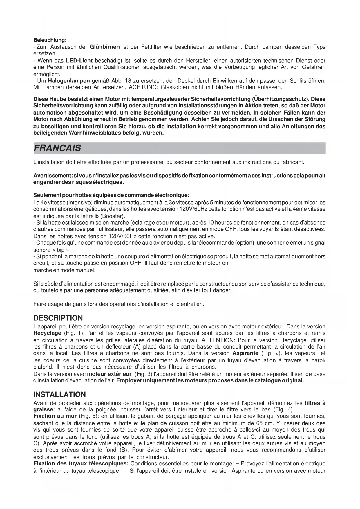 engendrer des risques électriques. Seulement pour hottes équipées de commande électronique: La 4e vitesse (intensive) diminue automatiquement à la 3e vitesse après 5 minutes de fonctionnement pour optimiser les consommations énergétiques; dans les hottes avec tension 120V/60Hz cette fonction n’est pas active et la 4ème vitesse est indiquée par la lettre b (Booster). - Si la hotte est laissée mise en marche (éclairage et/ou moteur), après 10 heures de fonctionnement, en cas d’absence d’autres commandes par l’utilisateur, elle passera automatiquement en mode OFF, tous les voyants étant désactivées. Dans les hottes avec tension 120V/60Hz cette fonction n’est pas active. - Chaque fois qu’une commande est donnée au clavier ou depuis la télécommande (option), une sonnerie émet un signal sonore « bip ». - Si pendant la marche de la hotte une coupure d’alimentation électrique se produit, la hotte se met automatiquement hors circuit, et sa touche passe en position OFF. Il faut donc remettre le moteur en marche en mode manuel. Si le câble d’alimentation est endommagé, il doit être remplacé par le constructeur ou son service d’assistance technique, ou toutefois par une personne adéquatement qualifiée, afin d’éviter tout danger. Faire usage de gants lors des opérations d'installation et d'entretien. DESCRIPTION L'appareil peut être en version recyclage, en version aspirante, ou en version avec moteur extérieur. Dans la version Recyclage (Fig. 1), l’air et les vapeurs convoyés par l’appareil sont épurés par les filtres à charbons et remis en circulation à travers les grilles latérales d’aération du tuyau. ATTENTION: Pour la version Recyclage utiliser les filtres à charbons et un déflecteur (A) placé dans la partie basse du conduit permettant la circulation de l’air dans le local. Les filtres à charbons ne sont pas fournis. Dans la version Aspirante (Fig. 2), les vapeurs et les odeurs de la cuisine sont convoyées directement à l’extérieur par un tuyau d’évacuation à travers la paroi/ plafond. Il n’est donc pas nécessaire d’utiliser les filtres à charbons. Dans la version avec moteur extérieur (Fig. 3) l'appareil doit être relié à un moteur extérieur séparée. Il sert de base d'installation d'évacuation de l'air. Employer uniquement les moteurs proposés dans le catalogue original. INSTALLATION Avant de procéder aux opérations de montage, pour manoeuvrer plus aisément l’appareil, démontez les filtres à graisse: à l'aide de la poignée, pousser l’arrêt vers l’intérieur et tirer le filtre vers le bas (Fig. 4). Fixation au mur (Fig. 5): en utilisant le gabarit de perçage appliquer au mur les chevilles qui vous sont fournies, sachant que la distance entre la hotte et le plan de cuisson doit être au minimum de 65 cm. Y insérer deux des vis qui vous sont fournies de sorte que votre appareil puisse être accroché à celles-ci au moyen des trous qui sont prévus dans le fond (utilisez les trous A; si la hotte est équipée de trous A et C, utilisez seulement le trous C). Après avoir accroché votre appareil, le fixer définitivement au mur en utilisant les deux autres vis et au moyen des trous prévus dans le fond (B). Pour éviter d’abîmer votre appareil, nous vous recommandons d’utiliser exclusivement les trous prévus par le constructeur. Fixation des tuyaux télescopiques: Conditions essentielles pour le montage: – Prévoyez l’alimentation électrique à l’intérieur du tuyau télescopique. – Si l'appareil doit être installé en version Aspirante ou en version avec moteurextérieur, prévoyer le trou d’évacuation de l’air. Posez le support (W) à 50 mm du plafond et placez-le à la verticale de votre hotte en vous aidant des encoches se trouvant au centre du support (Fig. 6); a l’aide d’un crayon marquez les 2 trous sur la paroi, puis percez et introduisez les chevilles qui sont fournies en équipement et fixez le support en utilisant les 2 vis (fournies). Version aspirante et version avec moteur extérieur: raccordez le conduit pour l’évacuation de l’air à la bouche de sortie de l’air de la hotte; utilisez un tuyau souple et bloquez-le sur la bouche de sortie de l’air de la hotte à l’aide d’un collier métallique (le tuyau et le collier ne sont pas fournis). Seulement pour la version avec moteur extérieur (Fig. 7): faire la connexion électrique entre le moteur extérieur et la hotte en utilisant les plaques de jonction appropriées: enlever l'élément A et le couvercle B de la boîte de connexion; fixer le cable de raccordement du moteur à la plaque de jonction C. Remonter l'élément A et le couvercle B de la boîte de connexion; l'autre extrémité du câble doit être fixée à la plaque de jonction du moteur extérieur. Effectuez le branchement électrique de la hotte à l’aide du câble d’alimentation. Prendre les 2 tuyaux ensemble et les poser sur la partie supérieure de la hotte. Soulevez le tuyau supérieur jusqu’au plafond et fixez-le au support à l’aide des 2 vis (Fig. 8). Versione recyclage: effectuez le branchement électrique de la hotte à l’aide du câble d’alimentation. Fixez le déflecteur d’air au tuyau inférieur comme indiqué à la Figure 9, en utilisant 2 vis. Prenez les 2 tuyaux ensemble et posez-les sur la partie supérieure de la hotte.Soulevez le tuyau supérieur jusqu’au plafond et fixez-le au support à l’aide des 2 vis (Fig. 8). De plus, nous rappelons que, dans la version recyclage, l’utilisation des filtres à charbon est nécessaire ; vérifiez s’ils sont installés, dans le cas contraire, montez-les en procédant comme suit, en fonction du modèle en votre possession: - si la hotte est équipée de filtres à charbon ronds (Fig. 10), accrochez les filtres à charbon avec un mouvement rotatoire, dans le sens contraire des aiguilles d’une montre. - si la hotte est équipée d’un filtre à charbo