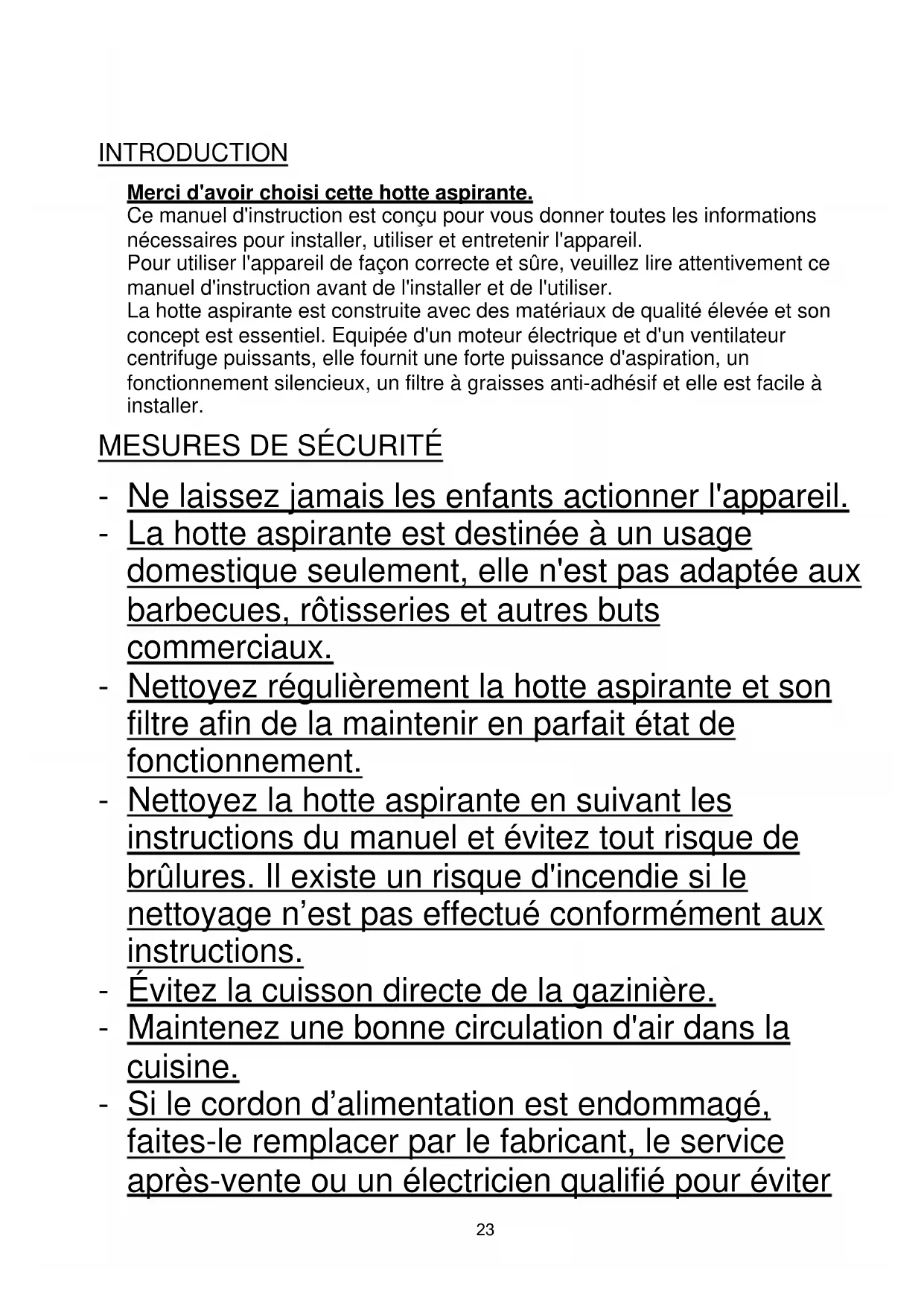 INTRODUCTION Merci d'avoir choisi cette hotte aspirante. Ce manuel d'instruction est conçu pour vous donner toutes les informations nécessaires pour installer, utiliser et entretenir l'appareil. Pour utiliser l'appareil de façon correcte et sûre, veuillez lire attentivement ce manuel d'instruction avant de l'installer et de l'utiliser. La hotte aspirante est construite avec des matériaux de qualité élevée et son concept est essentiel. Equipée d'un moteur électrique et d'un ventilateur centrifuge puissants, elle fournit une forte puissance d'aspiration, un fonctionnement silencieux, un filtre à graisses anti-adhésif et elle est facile à installer.
