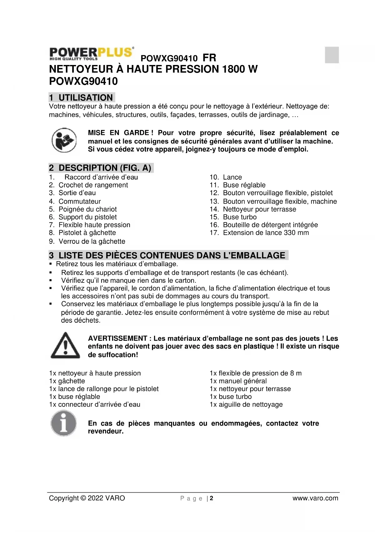 enfants ne doivent pas jouer avec des sacs en plastique ! Il existe un risque de suffocation! 1x nettoyeur à haute pression 1x gâchette 1x lance de rallonge pour le pistolet 1x buse réglable 1x connecteur d’arrivée d’eau 1x flexible de pression de 8 m 1x manuel général 1x nettoyeur pour terrasse 1x buse turbo 1x aiguille de nettoyage En cas de pièces manquantes ou endommagées, contactez votre revendeur.POWXG90410 FR Copyright © 2022 VARO P a g e | 3 www.varo.com 4 INSTRUCTIONS DE SÉCURITÉ SUPPLÉMENTAIRES POUR LES