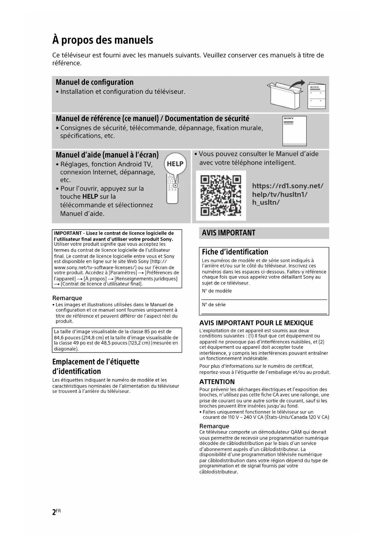 - Vous pouvez consulter le Manuel d’aide avec votre téléphone intelligent. https://rd1.sony.net/ help/tv/husltn1/ h_usltn/ IMPORTANT - Lisez le contrat de licence logicielle de l’utilisateur final avant d’utiliser votre produit Sony. Utiliser votre produit signifie que vous acceptez les termes du contrat de licence logicielle de l’utilisateur final. Le contrat de licence logicielle entre vous et Sony est disponible en ligne sur le site Web Sony (http://www.sony.net/tv-software-licenses/) ou sur l’écran de votre produit. Accédez à [Paramètres] t [Préférences de l'appareil] t [À propos] t [Renseignements juridiques] t [Contrat de licence d'utilisateur final].La taille d’image visualisable de la classe 85 po est de 84,6 pouces (214,8 cm) et la taille d’image visualisable de la classe 49 po est de 48,5 pouces (123,2 cm) (mesurée en diagonale). Fiche d’identification Les numéros de modèle et de série sont indiqués à l’arrière et/ou sur le côté du téléviseur. Inscrivez ces numéros dans les espaces ci-dessous. Faites-y référence chaque fois que vous appelez votre détaillant Sony au sujet de ce téléviseur.N° de modèleN° de sérieC:\Users\CHAILING_2\Desktop\SBH2_SBL2\UCM - 121\ML\CF\FY20\5014729121_FR.fm master page: Right