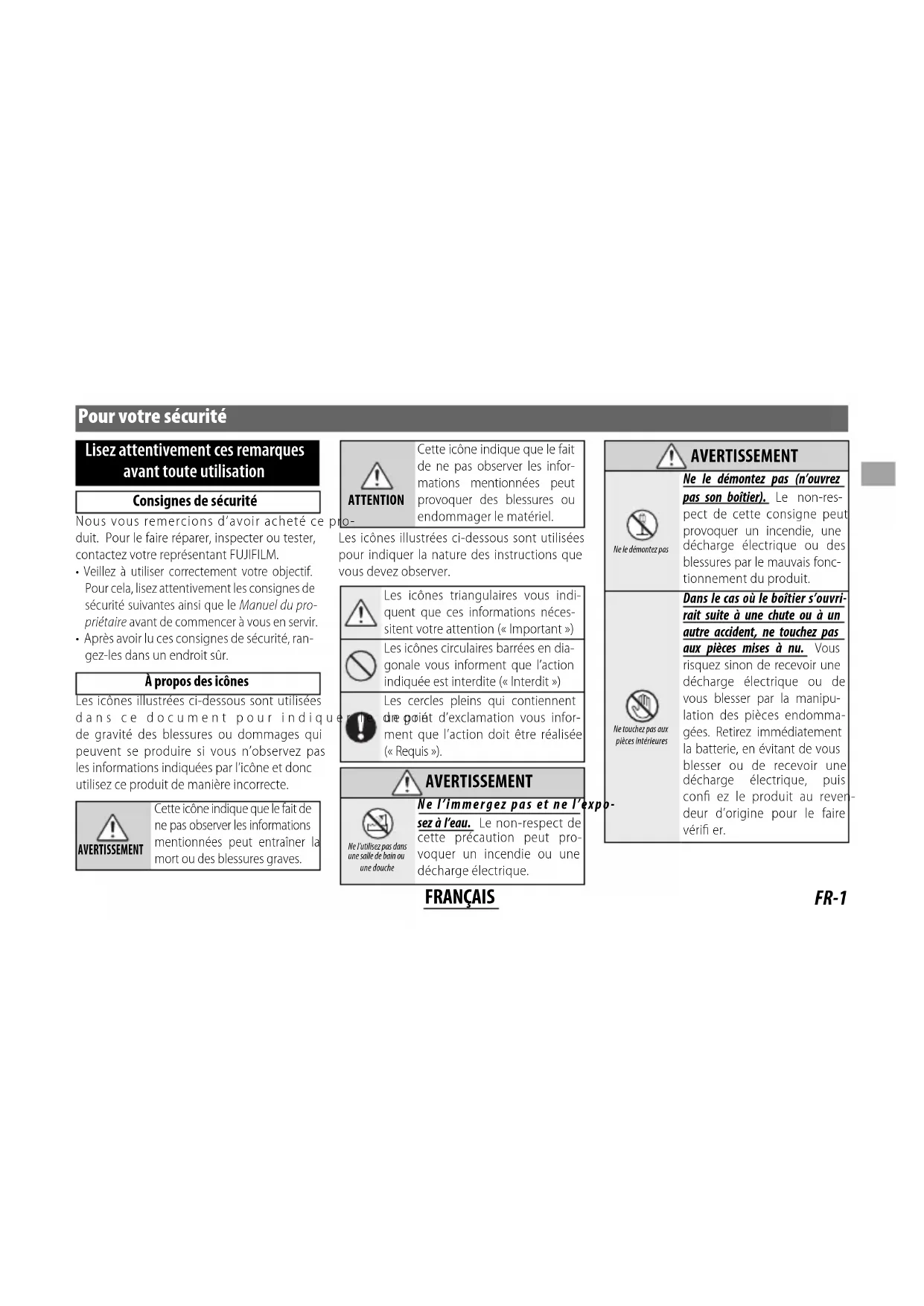 - Après avoir lu ces consignes de sécurité, ran- gez-les dans un endroit sûr. À propos des icônes Les icônes illustrées ci-dessous sont utilisées dans ce document pour indiquer le degré de gravité des blessures ou dommages qui peuvent se produire si vous n’observez pas les informations indiquées par l’icône et donc utilisez ce produit de manière incorrecte. AVERTISSEMENT Cette icône indique que le fait de ne pas observer les informations mentionnées peut entraîner la mort ou des blessures graves. ATTENTION Cette icône indique que le fait de ne pas observer les infor- mations mentionnées peut provoquer des blessures ou endommager le matériel. Les icônes illustrées ci-dessous sont utilisées pour indiquer la nature des instructions que vous devez observer. Les icônes triangulaires vous indi- quent que ces informations néces- sitent votre attention (« Important ») Les icônes circulaires barrées en dia- gonale vous informent que l’action indiquée est interdite (« Interdit ») Les cercles pleins qui contiennent un point d’exclamation vous infor- ment que l’action doit être réalisée (« Requis »). AVERTISSEMENT AVERTISSEMENT Ne l’utilisez pas dans une salle de bain ou une douche Ne l’immergez pas et ne l’expo- sez à l’eau. Le non-respect de cette précaution peut pro- voquer un incendie ou une décharge électrique. AVERTISSEMENT AVERTISSEMENT Ne le démontez pas Ne le démontez pas (n’ouvrez pas son boîtier). Le non-res- pect de cette consigne peut provoquer un incendie, une décharge électrique ou des blessures par le mauvais fonc- tionnement du produit. Ne touchez pas aux pièces intérieures Dans le cas où le boîtier s’ouvri- rait suite à une chute ou à un autre accident, ne touchez pas aux pièces mises à nu. Vous risquez sinon de recevoir une décharge électrique ou de vous blesser par la manipu- lation des pièces endomma- gées. Retirez immédiatement la batterie, en évitant de vous blesser ou de recevoir une décharge électrique, puis confi ez le produit au reven- deur d’origine pour le faire vérifi er.FR-2 FRANÇAIS AVERTISSEMENT AVERTISSEMENT Ne le placez pas sur des surfaces instables. Il risque de tomber et de blesser quelqu’un. Ne regardez pas le soleil à travers l’objectif ou le viseur de l’appareil photo. Le non- respect de cette précaution pourrait entraîner une défi - cience visuelle permanente. ATTENTION ATTENTION Ne l’utilisez pas et ne le rangez pas dans des lieux exposés à la vapeur, à la fumée ou qui sont très humides ou poussiéreux. Le non-respect de cette consigne peut provoquer un incendie ou une décharge électrique Ne le laissez pas en plein soleil ou dans des endroits exposés à des températures très élevées, comme dans un véhicule fermé par grand soleil. Le non-res- pect de cette consigne peut provoquer un incendie ATTENTION ATTENTION Conservez-le hors de la portée des enfants en bas âge. Il peut provoquer des blessures s’il est laissé dans les mains d’un enfant. Ne le manipulez pas avec des mains mouillées. Vous risquez sinon de recevoir un choc électrique. Lorsque vous photographiez un sujet à contre-jour, gardez le soleil à l’extérieur du cadre. Les rayons du soleil focalisés dans l’appareil photo lorsque le so- leil est à l’intérieur ou près du cadre peuvent provoquer des feux ou des brûlures. Remettez les bouchons en place et rangez-le à l’abri du soleil lorsque vous ne l’utilisez pas. Les rayons du soleil focalisés par l’objectif peuvent provo- quer des feux ou des brûlures. ATTENTION ATTENTION Ne transportez pas l’appareil photo ou l’objectif lorsqu’ils sont xés sur un trépied. Ils peuvent tomber ou taper d’autres ob- jets et blesser quelqu’un. Ne pas faire tourner rapidement l’appareil photo tout en main- tenant la poignée. Votre main pourrait heurter le trépied ou le pied à collier de trépied et occasionner des blessures. Avant d’utiliser l’appareil photo, bien serrer ou desserrer la vis de verrouillage du collier de trépied selon le mode d’utilisation de l’appareil, avec une orientation xe ou une rotation. Si la vis n’est que partiellement serrée, l’appareil photo pourrait se déplacer de façon inattendue et provoquer des blessures.FR-3 FRANÇAIS À l’attention des clients résidant aux États-Unis À l’attention des clients résidant aux États-Unis Testé pour être en conformité avec les normes de la FCC POUR UNE UTILISATION RÉSIDENTIELLE OU DE BUREAU Réglementation de la FCC : Cet appareil est conforme à la