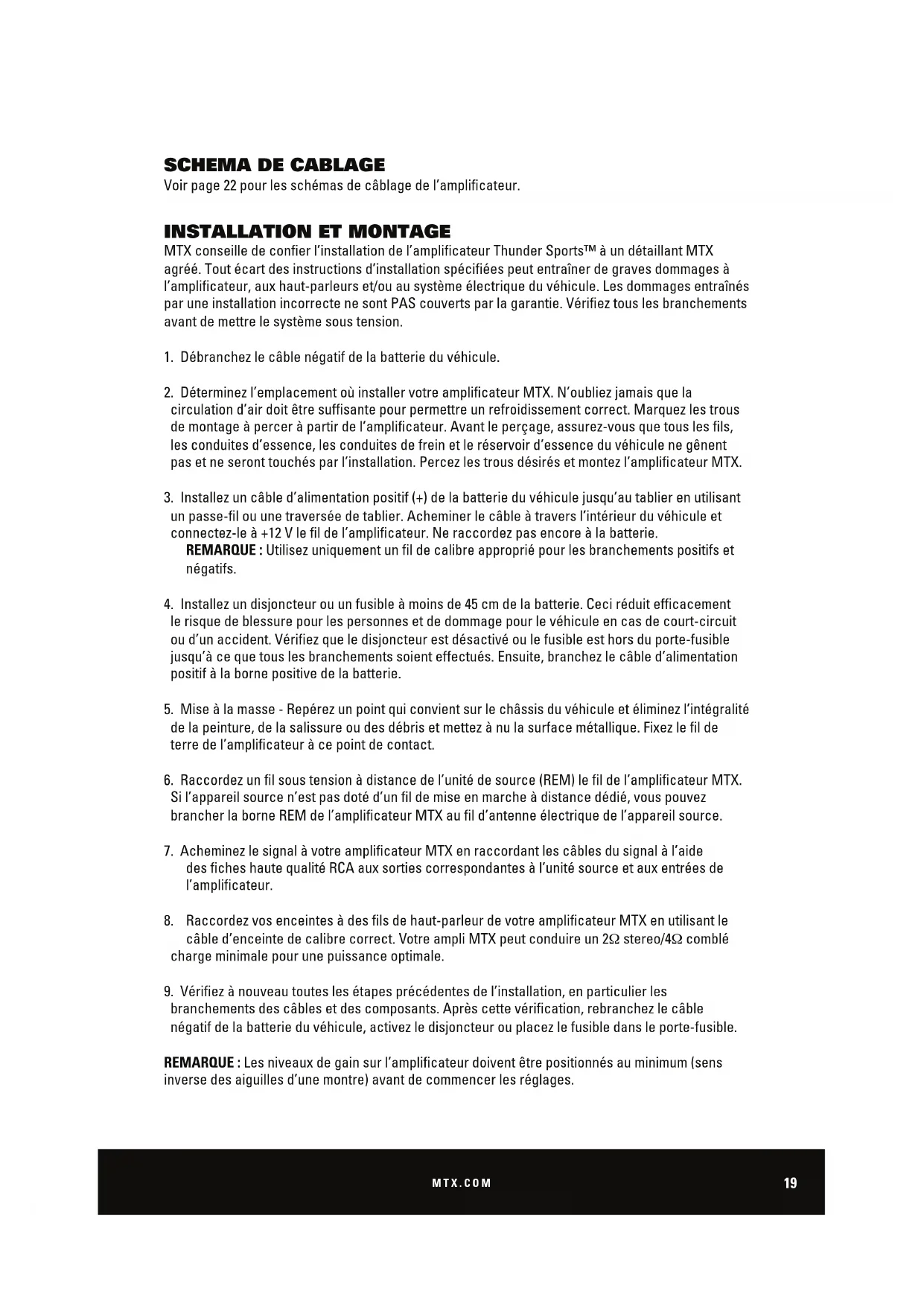 MTX conseille de confier l’installation de l’amplificateur Thunder Sports™ à un détaillant MTX agréé. Tout écart des instructions d’installation spécifiées peut entraîner de graves dommages à l’amplificateur, aux haut-parleurs et/ou au système électrique du véhicule. Les dommages entraînés par une installation incorrecte ne sont PAS couverts par la garantie. Vérifiez tous les branchements avant de mettre le système sous tension.