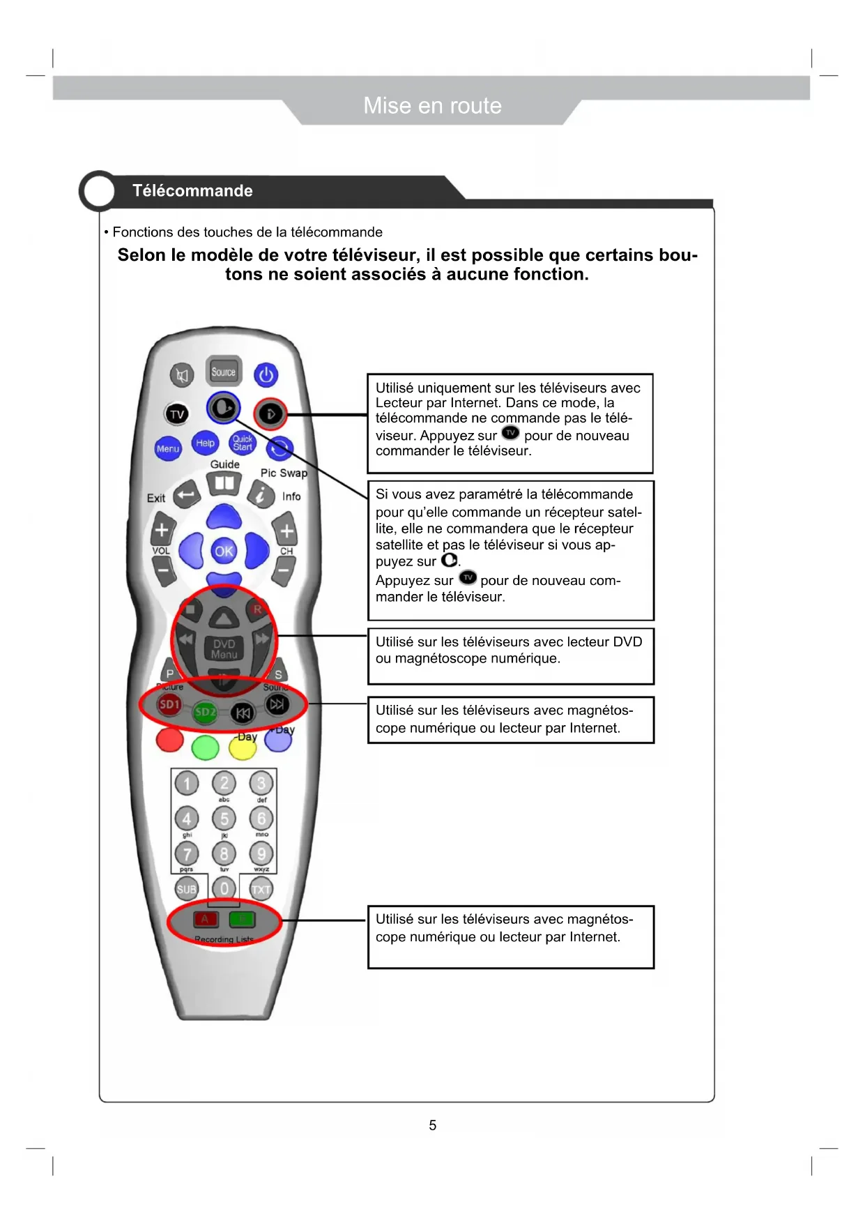 SURJUDPPHVTXHYRXVDYH]SUpYXG¶HQUH gistrer)7 Mise en route Télécommande Cette touche met la télécom- mande en mode de com- mande du téléviseur. Cette touche met la télécom- mande en mode de com- mande multi-satellite.