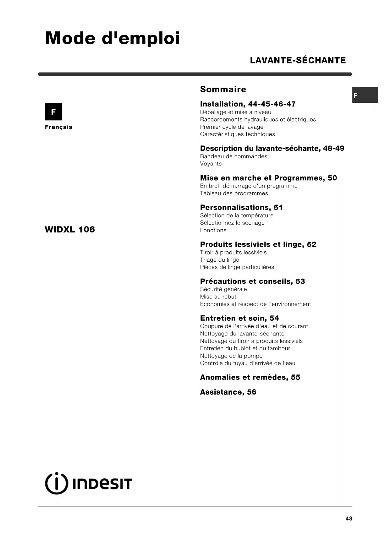Français Sommaire Installation, 44-45-46-47 Déballage et mise à niveau Raccordements hydrauliques et électriques Premier cycle de lavage Caractéristiques techniques Description du lavante-séchante, 48-49 Bandeau de commandes Voyants Mise en marche et Programmes, 50 En bref: démarrage d'un programme Tableau des programmes Personnalisations, 51 Sélection de la température Sélectionnez le séchage Fonctions Produits lessiviels et linge, 52 Tiroir à produits lessiviels Triage du linge Pièces de linge particulières Précautions et conseils, 53 Sécurité générale Mise au rebut Economies et respect de l'environnement Entretien et soin, 54 Coupure de l'arrivée d'eau et de courant Nettoyage du lavante-séchante Nettoyage du tiroir à produits lessiviels Entretien du hublot et du tambour Nettoyage de la pompe Contrôle du tuyau d'arrivée de l'eau Anomalies et remèdes, 55 Assistance, 56 LAVANTE-SÉCHANTE WIDXL 106 Mode d'emploi F44