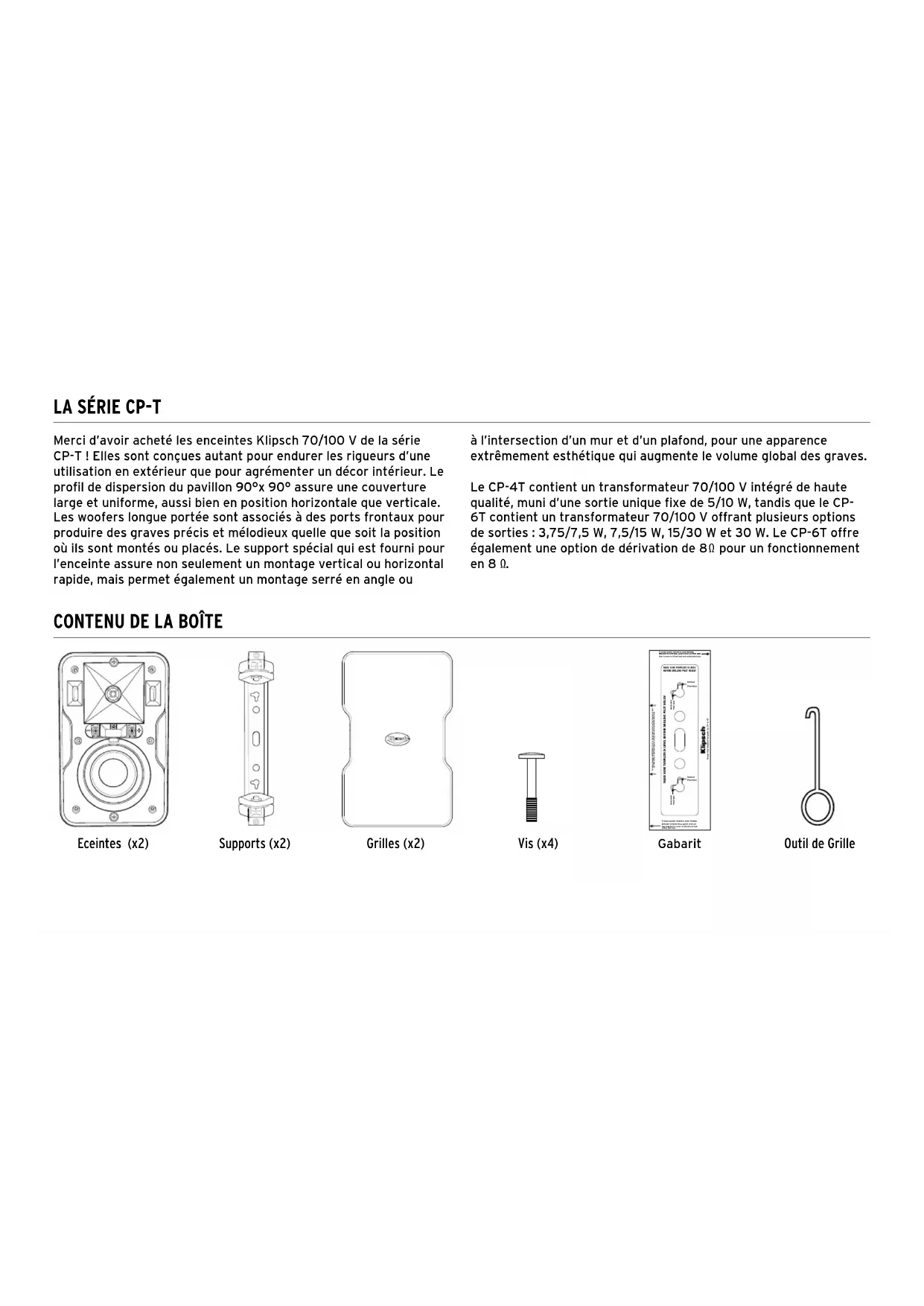 Merci d’avoir acheté les enceintes Klipsch 70/100 V de la série CP-T ! Elles sont conçues autant pour endurer les rigueurs d’une utilisation en extérieur que pour agrémenter un décor intérieur. Le profil de dispersion du pavillon 90°x 90° assure une couverture large et uniforme, aussi bien en position horizontale que verticale. Les woofers longue portée sont associés à des ports frontaux pour produire des graves précis et mélodieux quelle que soit la position où ils sont montés ou placés. Le support spécial qui est fourni pour l’enceinte assure non seulement un montage vertical ou horizontal rapide, mais permet également un montage serré en angle ou à l’intersection d’un mur et d’un plafond, pour une apparence extrêmement esthétique qui augmente le volume global des graves. Le CP-4T contient un transformateur 70/100 V intégré de haute qualité, muni d’une sortie unique fixe de 5/10 W, tandis que le CP- 6T contient un transformateur 70/100 V offrant plusieurs options de sorties : 3,75/7,5 W, 7,5/15 W, 15/30 W et 30 W. Le CP-6T offre également une option de dérivation de 8