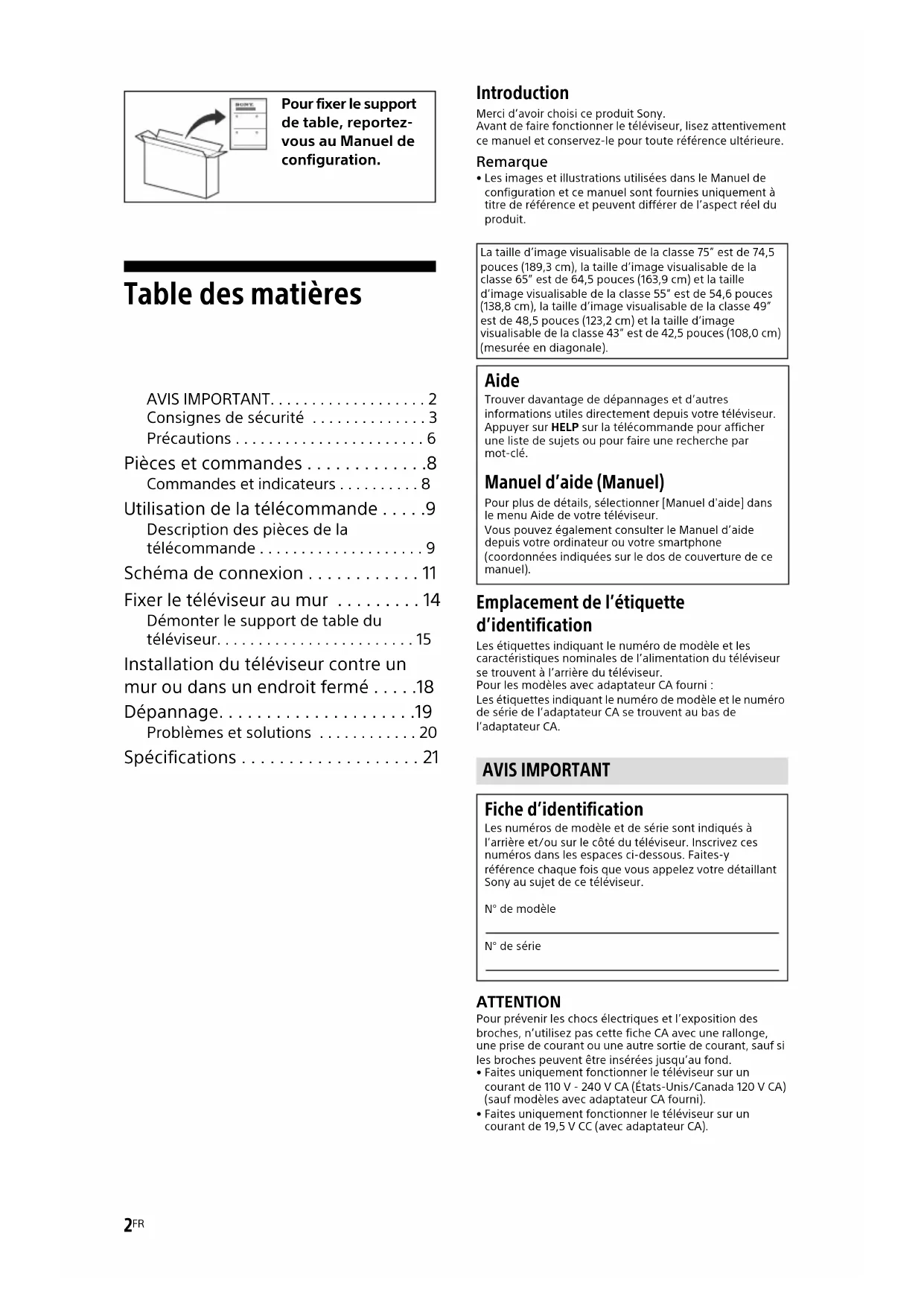 - Les images et illustrations utilisées dans le Manuel de configuration et ce manuel sont fournies uniquement à titre de référence et peuvent différer de l’aspect réel du produit. Emplacement de l’étiquette d’identification Les étiquettes indiquant le numéro de modèle et les caractéristiques nominales de l’alimentation du téléviseur se trouvent à l’arrière du téléviseur.Pour les modèles avec adaptateur CA fourni :Les étiquettes indiquant le numéro de modèle et le numéro de série de l’adaptateur CA se trouvent au bas de l’adaptateur CA. ATTENTION Pour prévenir les chocs électriques et l’exposition des broches, n’utilisez pas cette fiche CA avec une rallonge, une prise de courant ou une autre sortie de courant, sauf si les broches peuvent être insérées jusqu’au fond. • Faites uniquement fonctionner le téléviseur sur un courant de 110 V - 240 V CA (États-Unis/Canada 120 V CA) (sauf modèles avec adaptateur CA fourni).• Faites uniquement fonctionner le téléviseur sur un courant de 19,5 V CC (avec adaptateur CA). Pour fixer le support de table, reportez- vous au Manuel de configuration. La taille d’image visualisable de la classe 75” est de 74,5 pouces (189,3 cm), la taille d’image visualisable de la classe 65” est de 64,5 pouces (163,9 cm) et la taille d’image visualisable de la classe 55” est de 54,6 pouces (138,8 cm), la taille d’image visualisable de la classe 49” est de 48,5 pouces (123,2 cm) et la taille d’image visualisable de la classe 43” est de 42,5 pouces (108,0 cm) (mesurée en diagonale). Aide Trouver davantage de dépannages et d’autres informations utiles directement depuis votre téléviseur. Appuyer sur HELP sur la télécommande pour afficher une liste de sujets ou pour faire une recherche par mot-clé. Manuel d’aide (Manuel) Pour plus de détails, sélectionner [Manuel d'aide] dans le menu Aide de votre téléviseur. Vous pouvez également consulter le Manuel d’aide depuis votre ordinateur ou votre smartphone (coordonnées indiquées sur le dos de couverture de ce manuel). AVIS IMPORTANT Fiche d’identification Les numéros de modèle et de série sont indiqués à l’arrière et/ou sur le côté du téléviseur. Inscrivez ces numéros dans les espaces ci-dessous. Faites-y référence chaque fois que vous appelez votre détaillant Sony au sujet de ce téléviseur.N° de modèleN° de série3